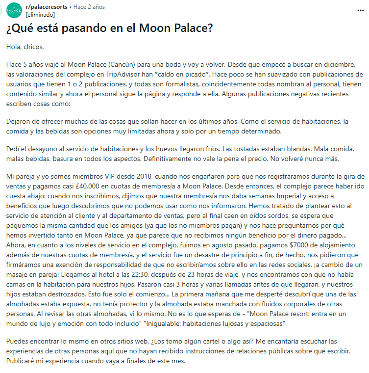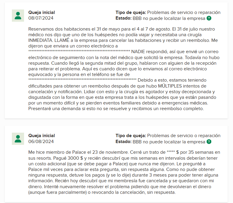 Incluso existe un grupo privado en Facebook llamado "Palace Members – DISAPPOINTED & FRUSTRATED" dedicado a compartir quejas. Pero es privado, probablemente para evitar que Palace Resorts se infiltre entre los miembros.