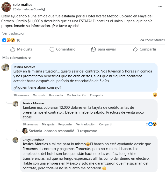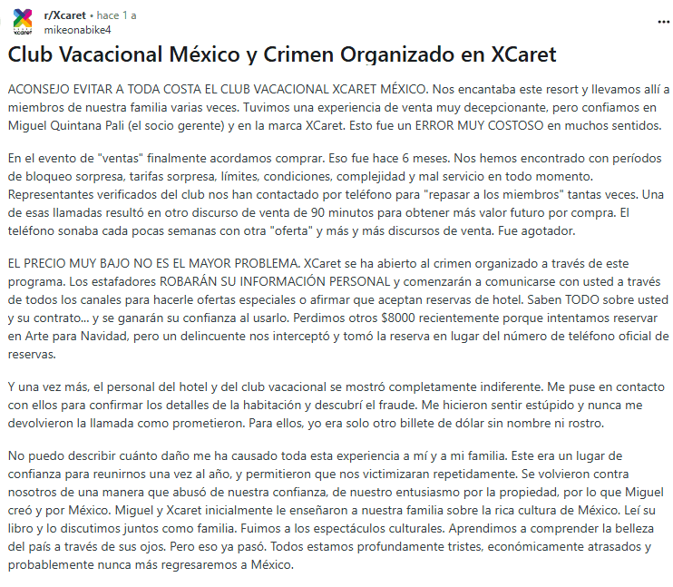 Algunos miembros han reportado pérdidas financieras significativas debido a los términos de sus acuerdos de membresía vacacional. Un grupo de Facebook titulado "Estafados por Mexico Xcaret Destination Club" destaca casos como el de una persona que perdió $11,000, alegando que toda la operación era una estafa. Estas historias ilustran lo costoso que puede ser entrar en un contrato sin comprender completamente sus implicaciones.