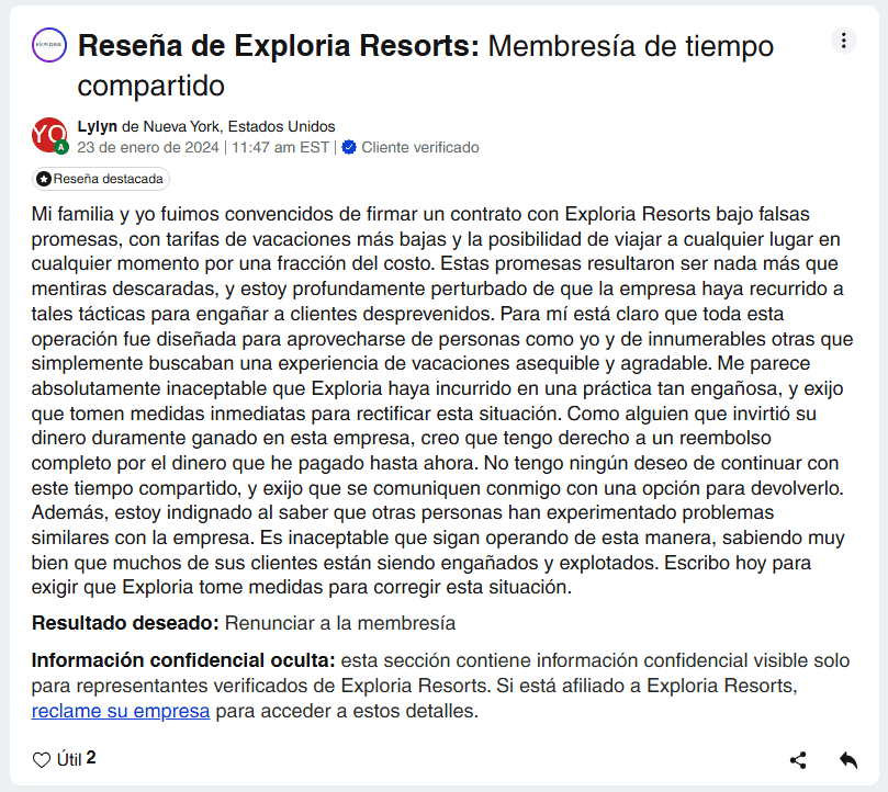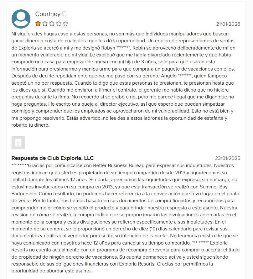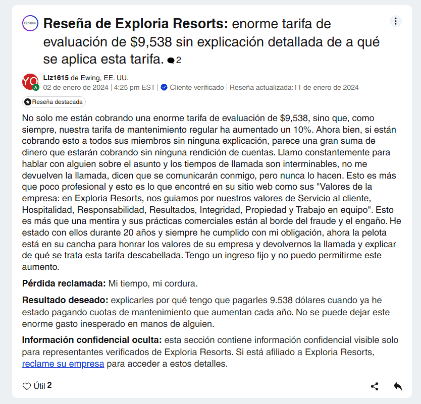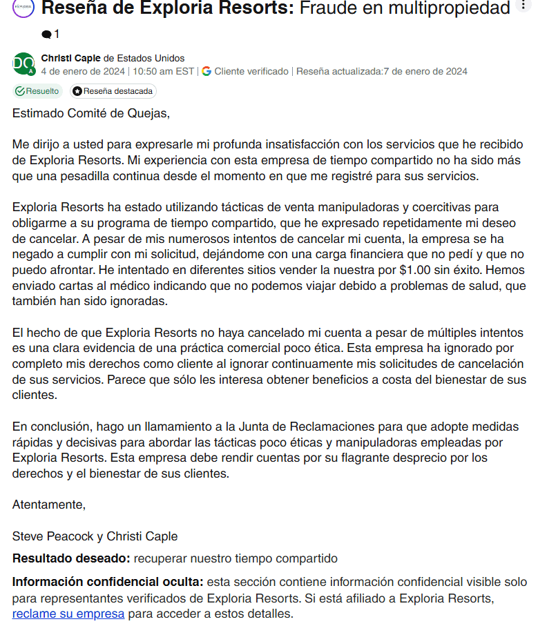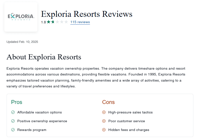 Exploria Resorts, una empresa de hospitalidad fundada en 1995 y con sede en Clermont, Florida, ofrece servicios de gestión y propiedad vacacional en varios destinos de EE.UU., incluyendo Orlando, Florida, y Gatlinburg, Tennessee. Aunque la empresa cuenta con más de 85,000 propietarios en todo el mundo, una gran cantidad de ellos han expresado su insatisfacción con su experiencia.