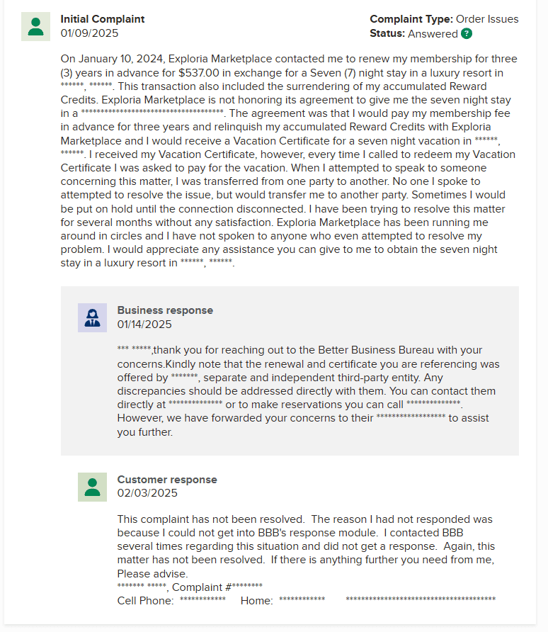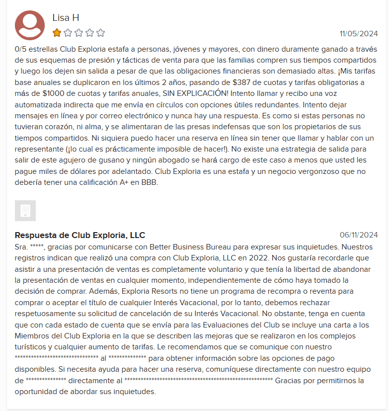 Además, Exploria Resorts ha recibido calificaciones notablemente bajas en plataformas de reseñas de consumidores, reflejando un alto nivel de insatisfacción. La empresa tiene una calificación de 1.8 estrellas en ConsumerAffairs con 115 reseñas y 1.17 en la Better Business Bureau (BBB) con 89 reseñas, lo que subraya estos problemas recurrentes.