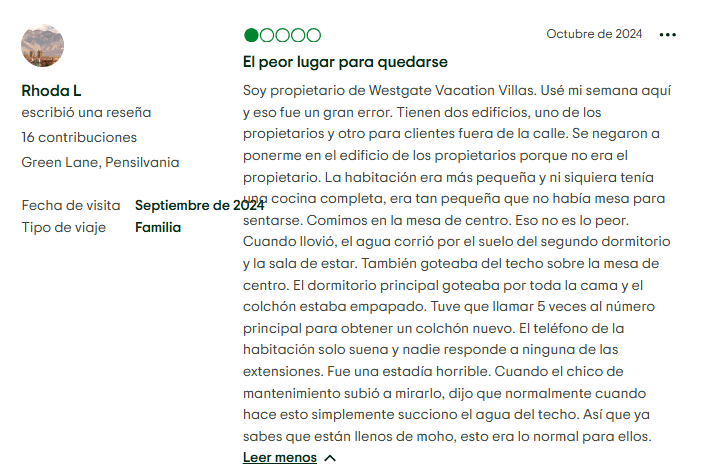 Además, Westgate Resorts ha estado involucrado en varias disputas legales, incluyendo demandas con contratistas, acciones colectivas y litigios con empresas de salida de tiempos compartidos. En un caso notable de 2024, Westgate ganó contra una empresa de salida. Estos problemas, aunque no siempre específicos de esta propiedad, afectan su reputación general.