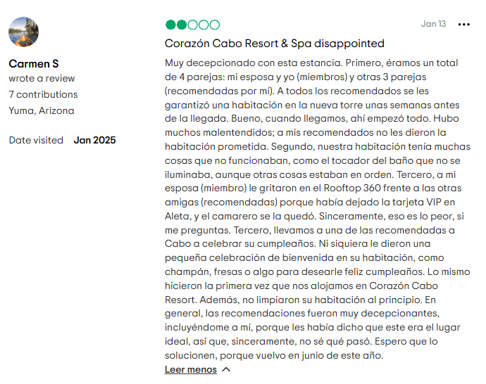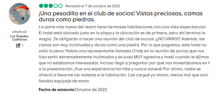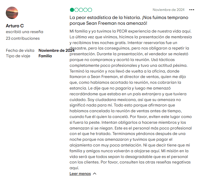 1. Tácticas de venta agresivas: Muchos visitantes reportan presentaciones de tiempo compartido disfrazadas de tours de bienvenida o desayunos “informativos”. Lo que empieza como un “regalo gratuito” termina siendo una presentación de varias horas con presión emocional para firmar en ese momento.