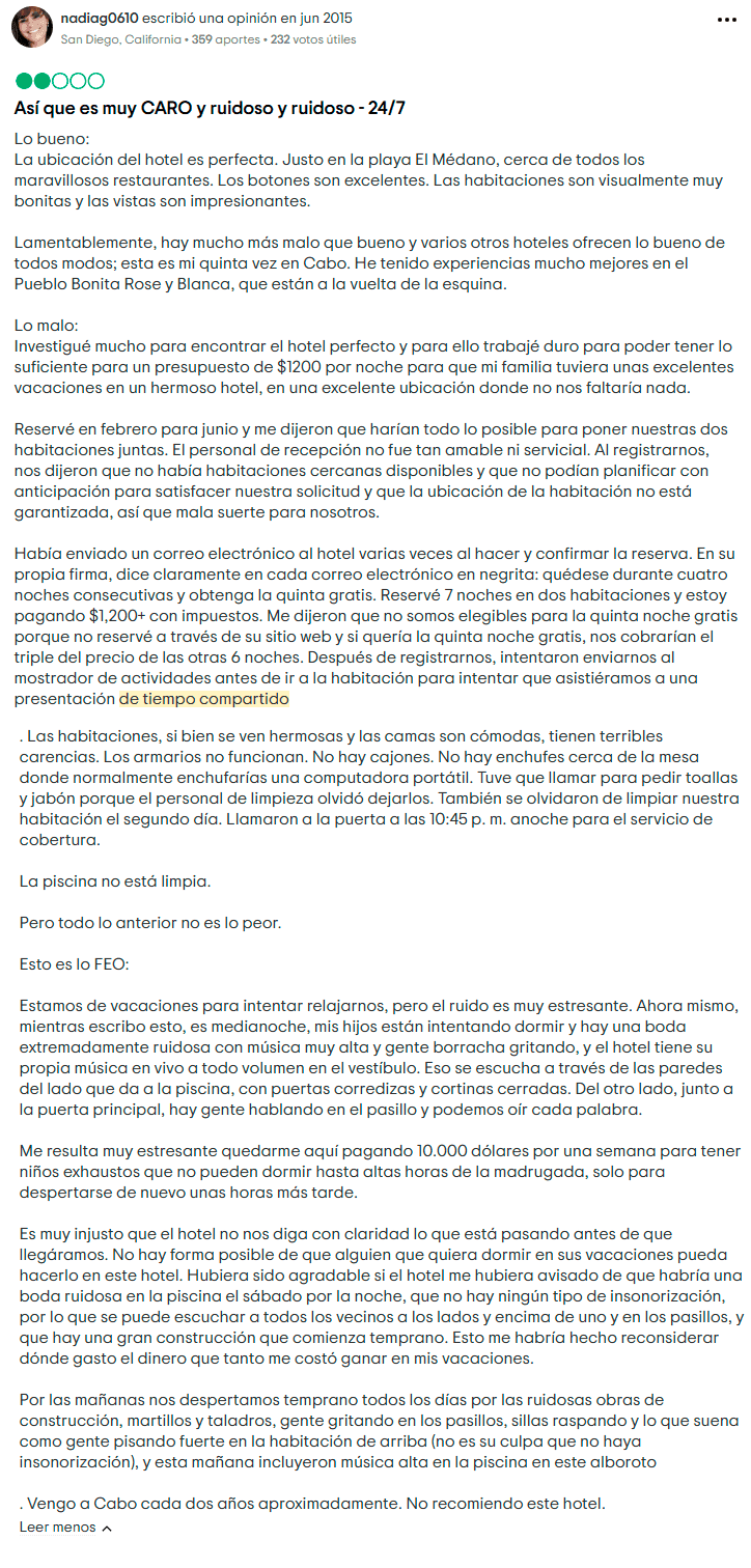 - Molestias que No Desaparecen: El ruido, la calidad de la comida y las tarifas inexplicables no son problemas temporales; son temas recurrentes. Cuando los problemas son tan consistentes, es seguro decir que es poco probable que mejoren pronto.