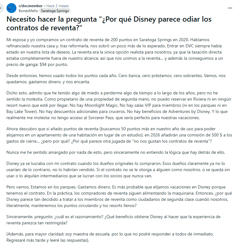 Los contratos de DVC están diseñados para el largo plazo, y Disney no facilita la salida. No existe una opción simple para “devolver” la membresía, y las restricciones de reventa suelen dejar a los propietarios con pocos compradores o pérdidas significativas. Para algunos, el alquiler de puntos ya no compensa los costos debido a las políticas más estrictas. Para otros, el estrés de gestionar puntos y cuotas supera el beneficio de hospedarse dentro del sistema.