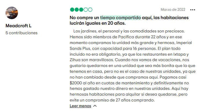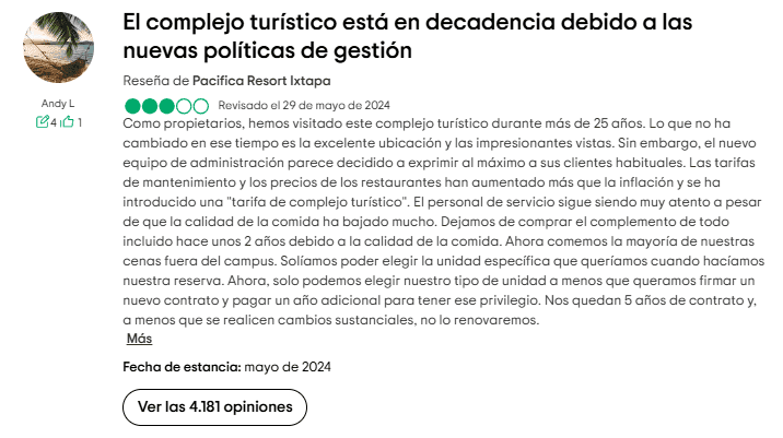 Pacifica Resorts no ha escapado a las críticas por la disminución de calidad con el tiempo. Los huéspedes a largo plazo han notado cambios que se sienten menos como “mejoras” y más como “medidas de reducción de costos.” Aumentos en las tarifas, servicios reducidos y una nueva “tarifa del resort” han dejado un sabor amargo para muchos. Un revisor señaló que las tarifas de mantenimiento y los precios de los restaurantes han superado la inflación, haciendo más difícil justificar el gasto de poseer un tiempo compartido aquí.