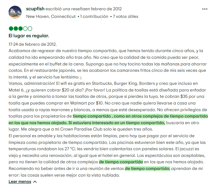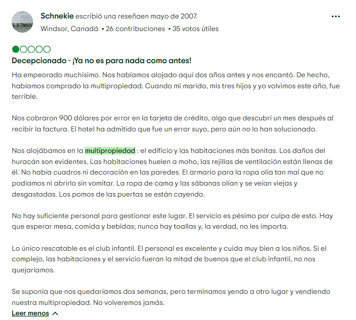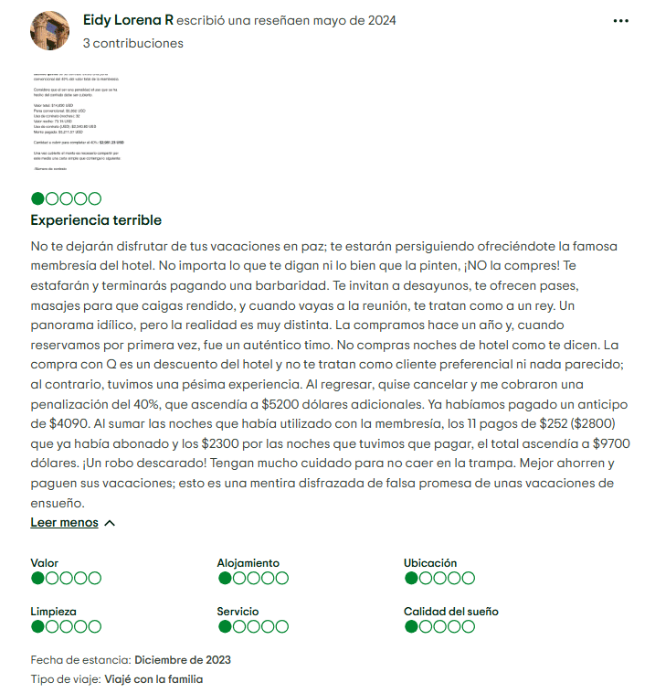 Presión de Ventas Agresiva: Muchos viajeros cuentan haber sido invitados a presentaciones con la promesa de desayunos gratuitos o pequeños regalos, solo para terminar en reuniones largas e insistentes donde se les presionó a firmar inmediatamente. Algunas personas mencionan que se les hicieron promesas verbales que luego no aparecieron en el contrato.