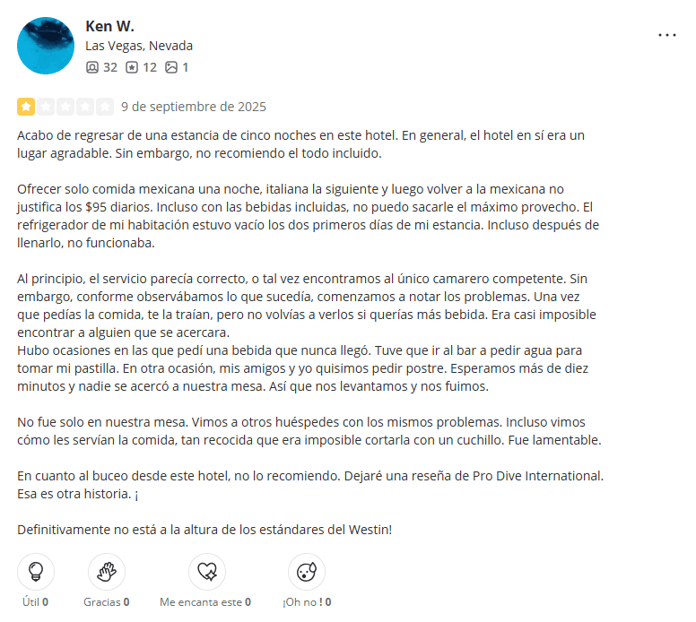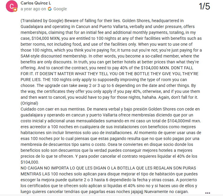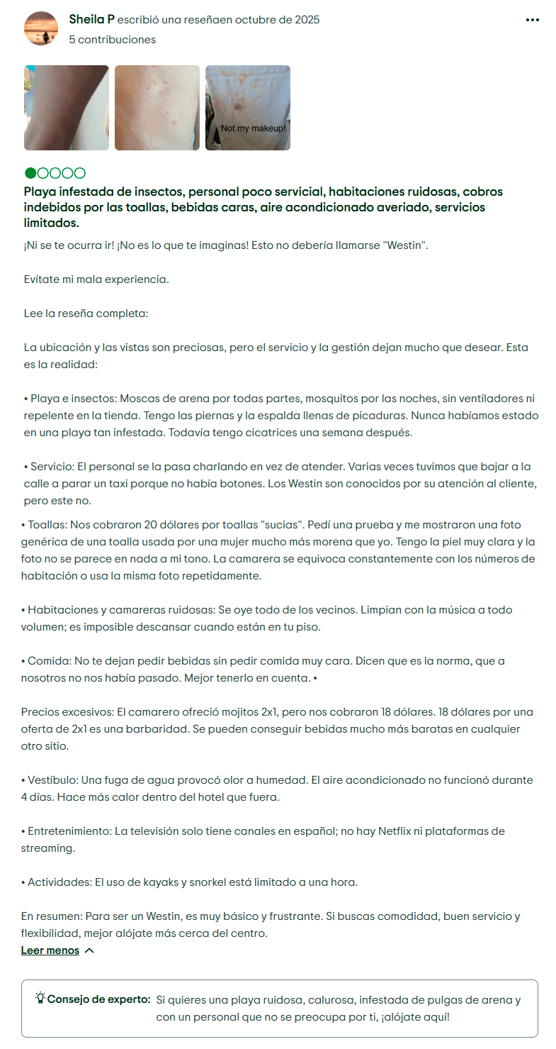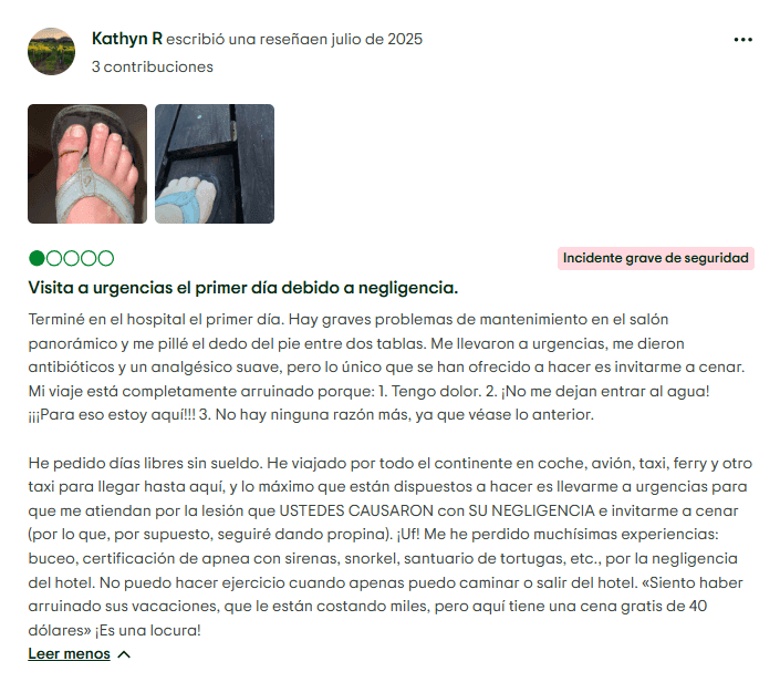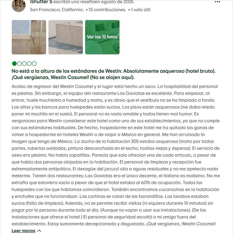 Problemas de Hospedaje y Riesgos de Seguridad: Aunque no ocurre en todos los casos, varios huéspedes han reportado recibir un trato deficiente por parte del personal o encontrar instalaciones en mal estado. En una situación documentada, un visitante en The Westin Cozumel afirmó haber sufrido una lesión debido a condiciones inseguras dentro del hotel. Este tipo de testimonios generan preocupación sobre el mantenimiento y la seguridad en propiedades asociadas con Golden Shores.