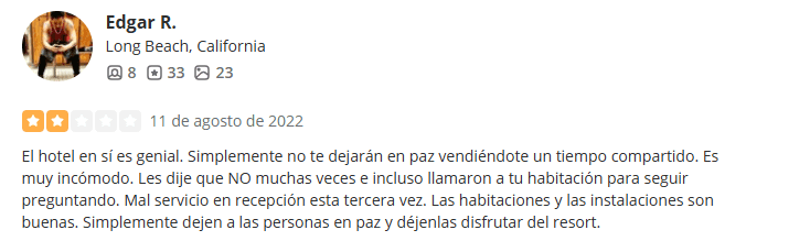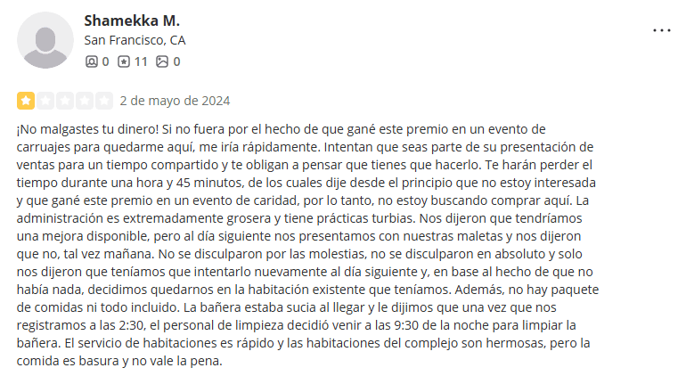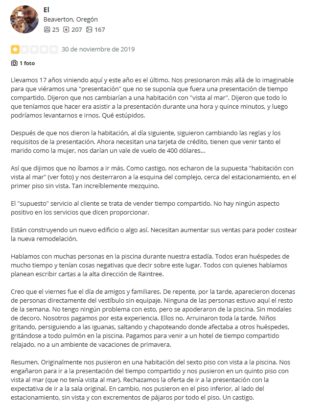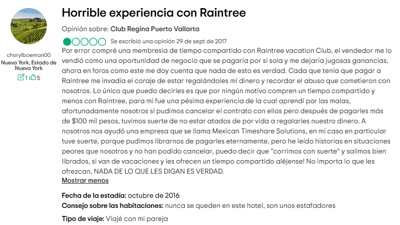 Raintree Vacation Club ha recibido una cantidad significativa de comentarios negativos en varias plataformas de reseñas. Las quejas comunes incluyen tácticas de ventas agresivas y un servicio al cliente deficiente.