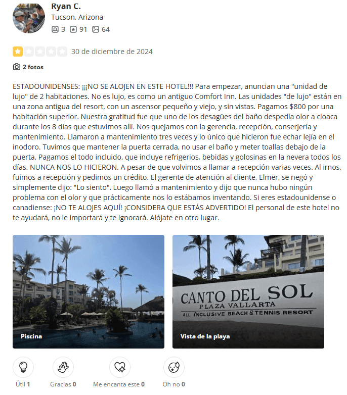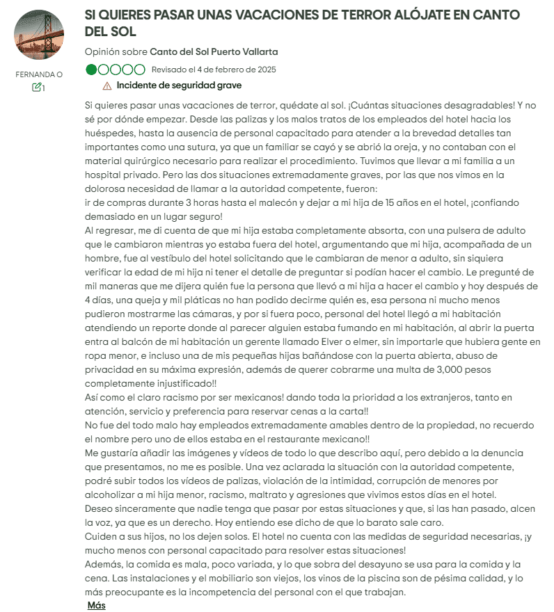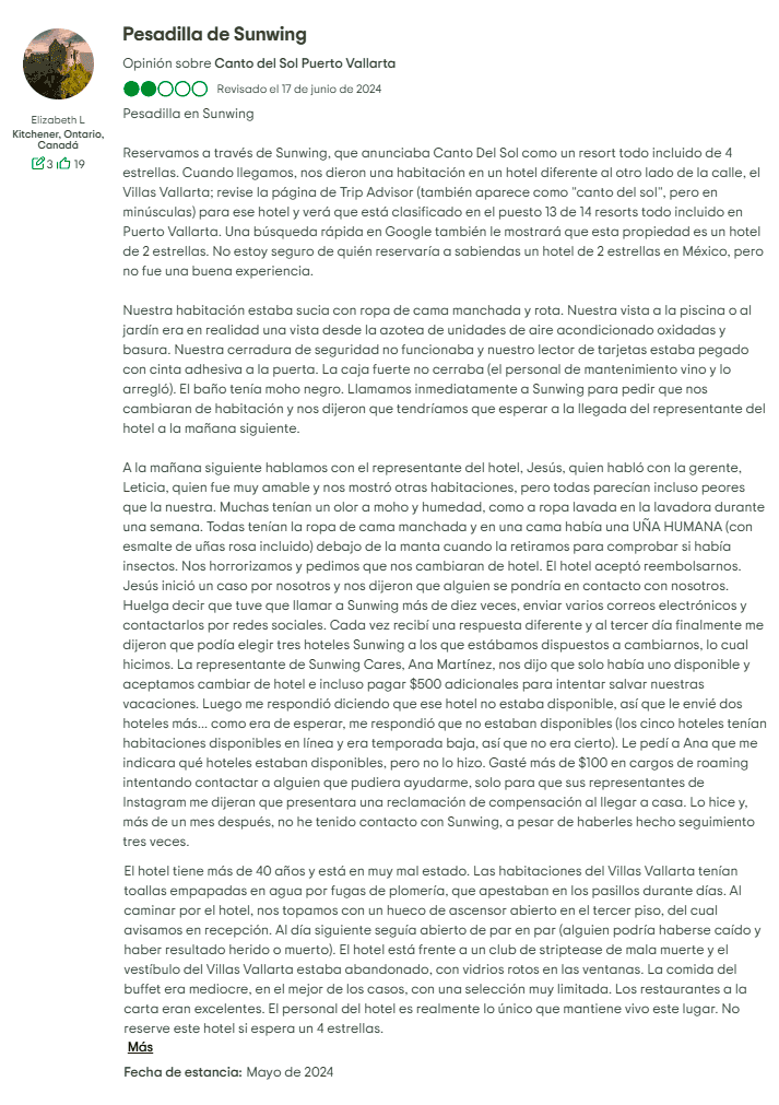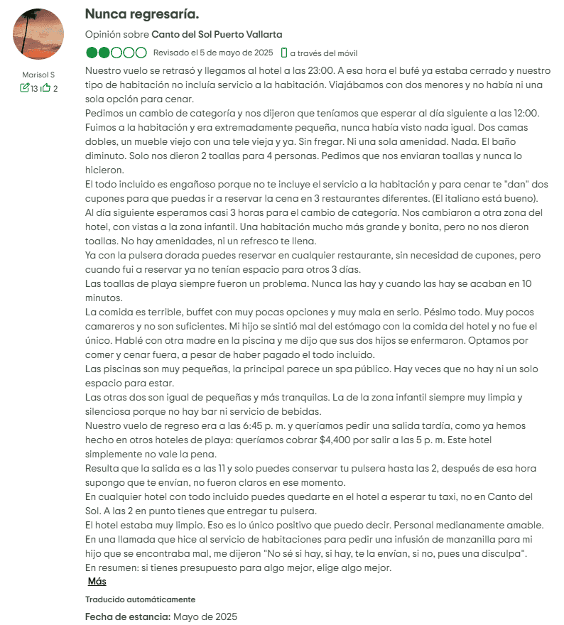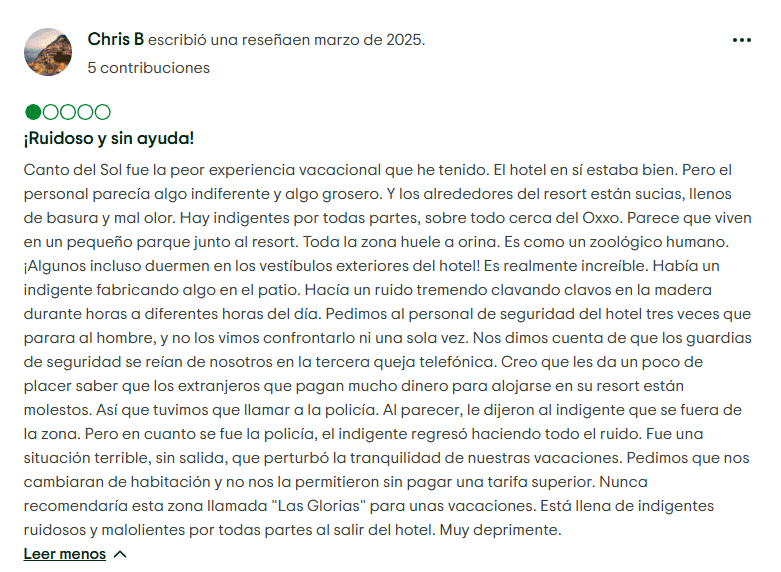 Presencia y Ventas de Tiempo Compartido: Una de las características definitorias de Canto del Sol es su larga conexión con la propiedad de tiempo compartido. Los viajeros informan regularmente que se les aborda con ofertas que comienzan como "descuentos" o "reembolsos", solo para darse cuenta de que están sentados en una presentación de tiempo compartido. Para los propietarios, esto se ha traducido en tarifas de mantenimiento continuas, presión de ventas adicional y dificultades para revender o cancelar contratos. A diferencia de una reserva de vacaciones regular, los compromisos de tiempo compartido pueden convertirse en una carga financiera a largo plazo, especialmente cuando la propiedad no cumple con las expectativas.