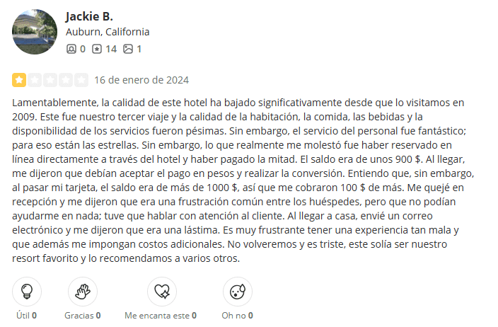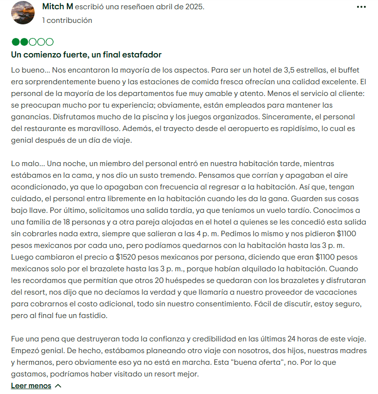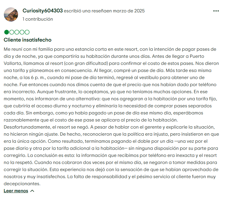 Tarifas y Políticas Ocultas: El resort hace cumplir reglas estrictas, como una multa de $40 USD por perder una tarjeta de toalla. Los huéspedes también han reportado cargos sorpresa por mejoras cuando sus habitaciones no eran satisfactorias, así como depósitos adicionales o tarifas por persona extra que no se explicaron claramente desde el principio. Muchos se sintieron engañados por los mostradores de "descuento" en el check-in que resultaron ser argumentos de venta.