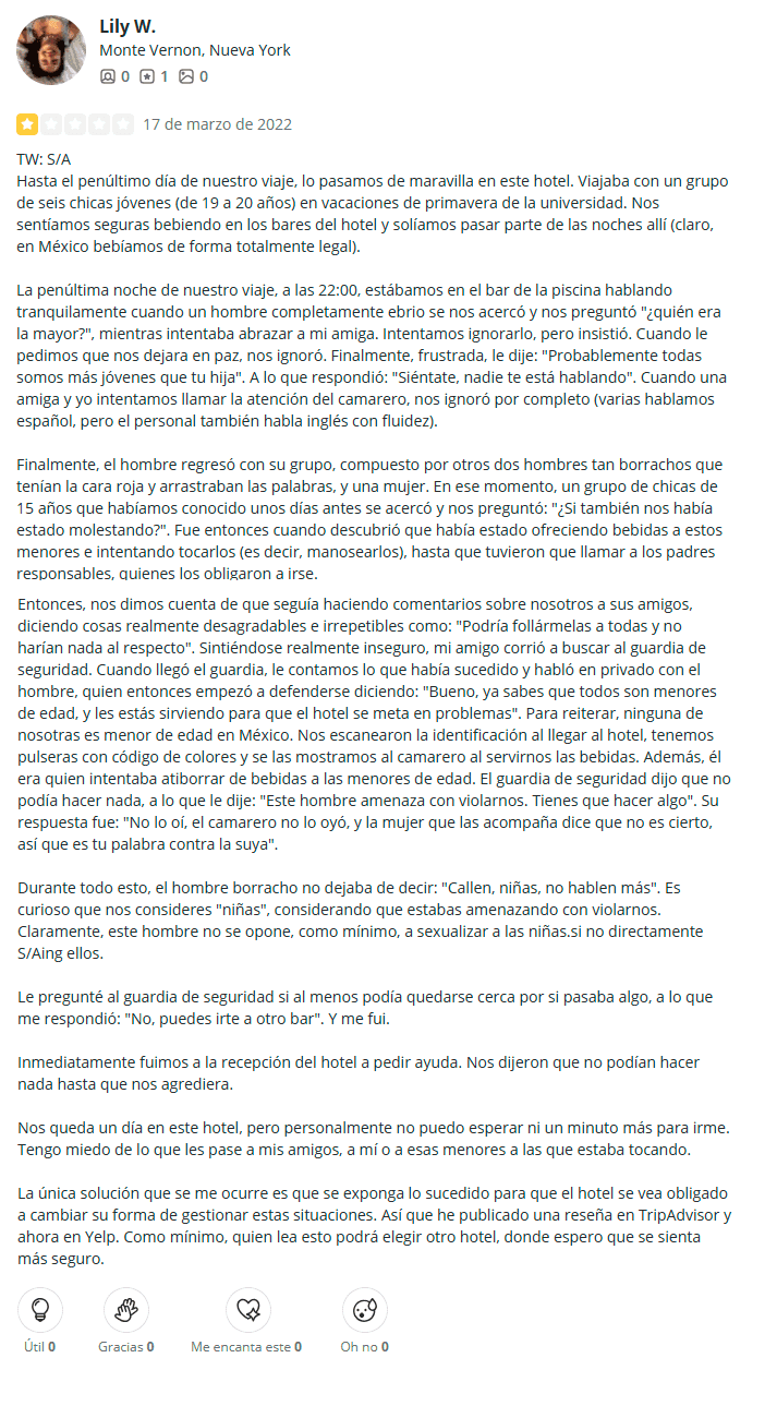 Preocupaciones de Seguridad: Una reseña preocupante detalló acoso por parte de un miembro del personal cerca del área del bar, lo que generó preocupaciones sobre la seguridad de las mujeres en la propiedad. Si bien estos informes pueden no estar muy extendidos, son lo suficientemente serios como para ser considerados al evaluar la propiedad a largo plazo.
