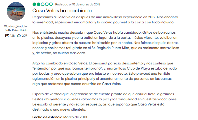 2. Política de solo adultos no siempre respetada: Uno de los mayores atractivos de Casa Velas es su etiqueta de “solo adultos”, sin niños menores de 16 años. Sin embargo, múltiples reseñas mencionan que a veces se hacen excepciones para VIPs o familias, sin avisar claramente a los demás huéspedes. El resultado: