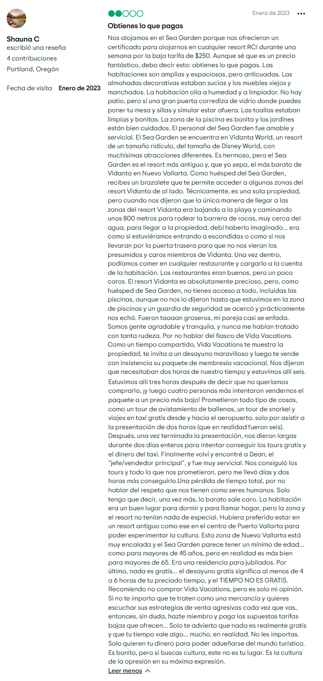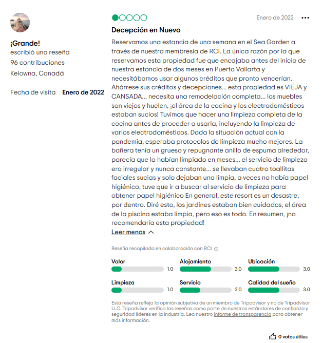 - Dificultad para revender. Los tiempos compartidos son infamemente difíciles de vender, y la mala reputación de Sea Garden no ayuda.