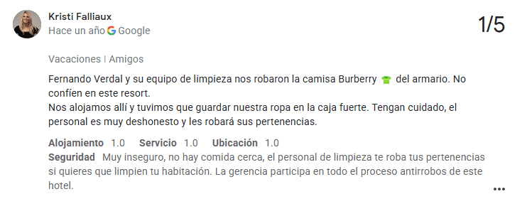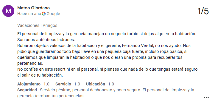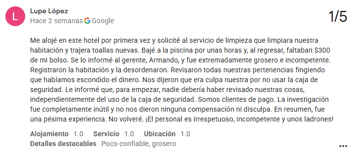 Uno de los problemas más alarmantes es el robo. Se han reportado múltiples casos en los que el personal de limpieza ha robado pertenencias de los huéspedes. Y no se trata de incidentes aislados: es un problema recurrente. Perder tus cosas en vacaciones ya es bastante molesto, pero cuando supuestamente es el personal del hotel quien se lleva tus pertenencias, la situación se vuelve inaceptable.