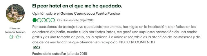 - Gamma Cuernavaca Puerta Paraíso: Habitaciones sucias y catalogado por muchos como el peor hotel de Posadas.