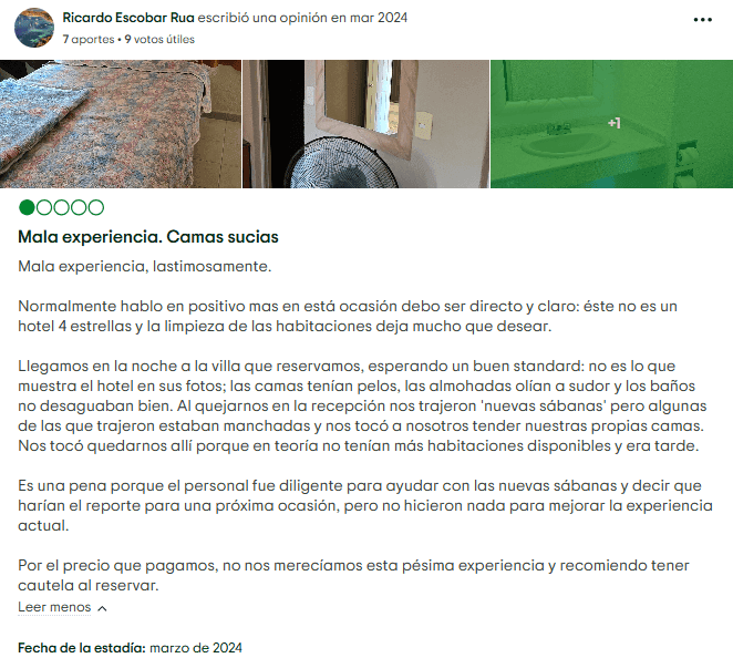 - Problemas de limpieza: Huéspedes han reportado sábanas sucias, ropa de cama manchada, moho en los baños e incluso cucarachas.