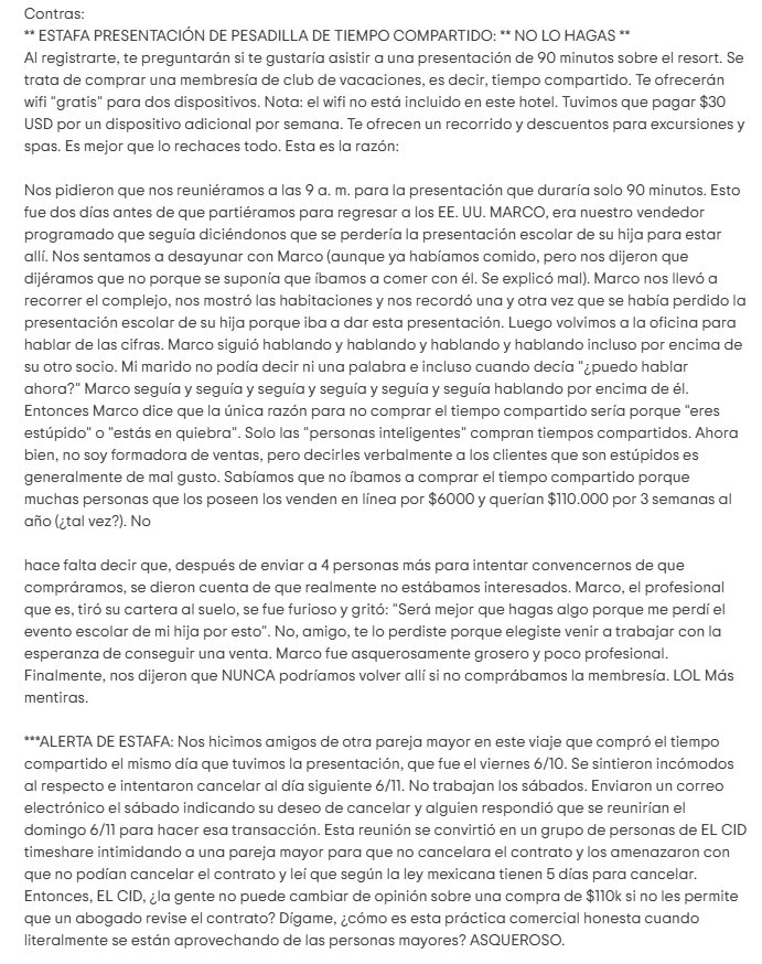 Primero, hay que reconocerlo: los resorts de El Cid son genuinamente atractivos. Están ubicados en lugares privilegiados—playas prístinas, aguas cristalinas y un aire de exclusividad. Además, son parte de la red de Resorts Condominium International (RCI), lo que significa que te venden la idea de posibilidades infinitas de vacaciones. Para muchos, el atractivo de una vida de vacaciones glamorosas es difícil de resistir.
