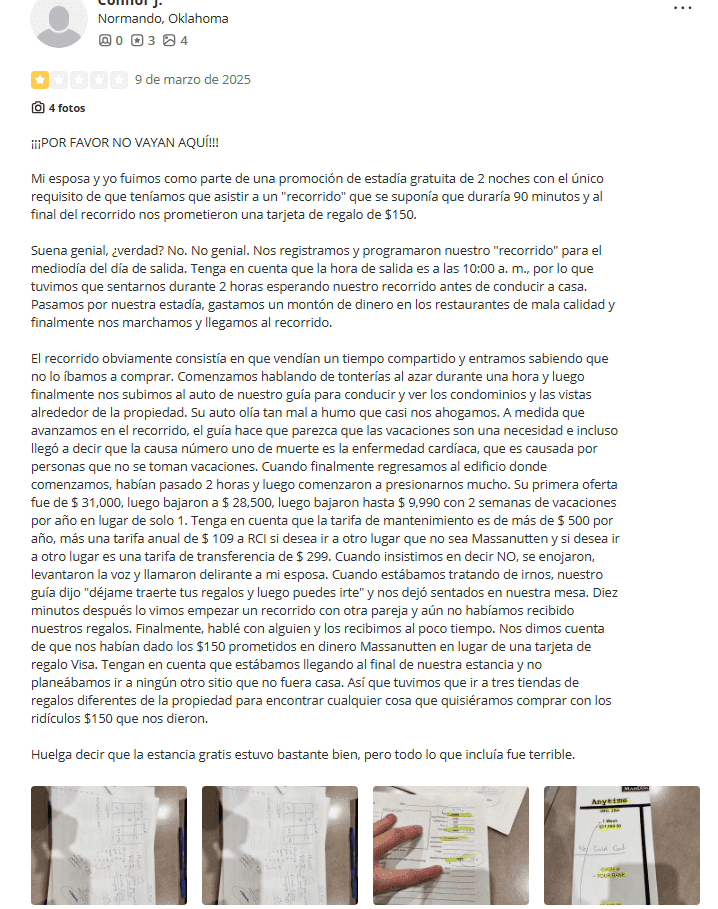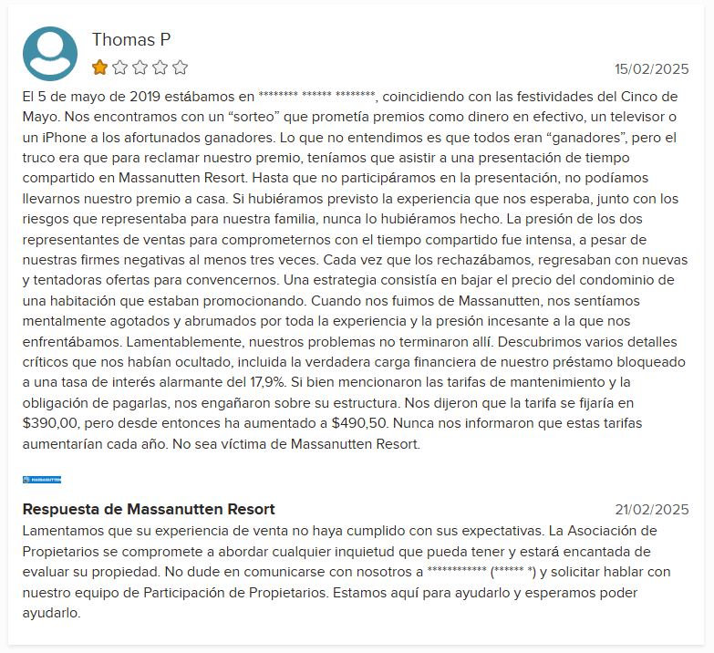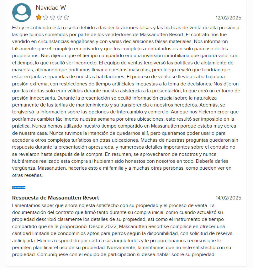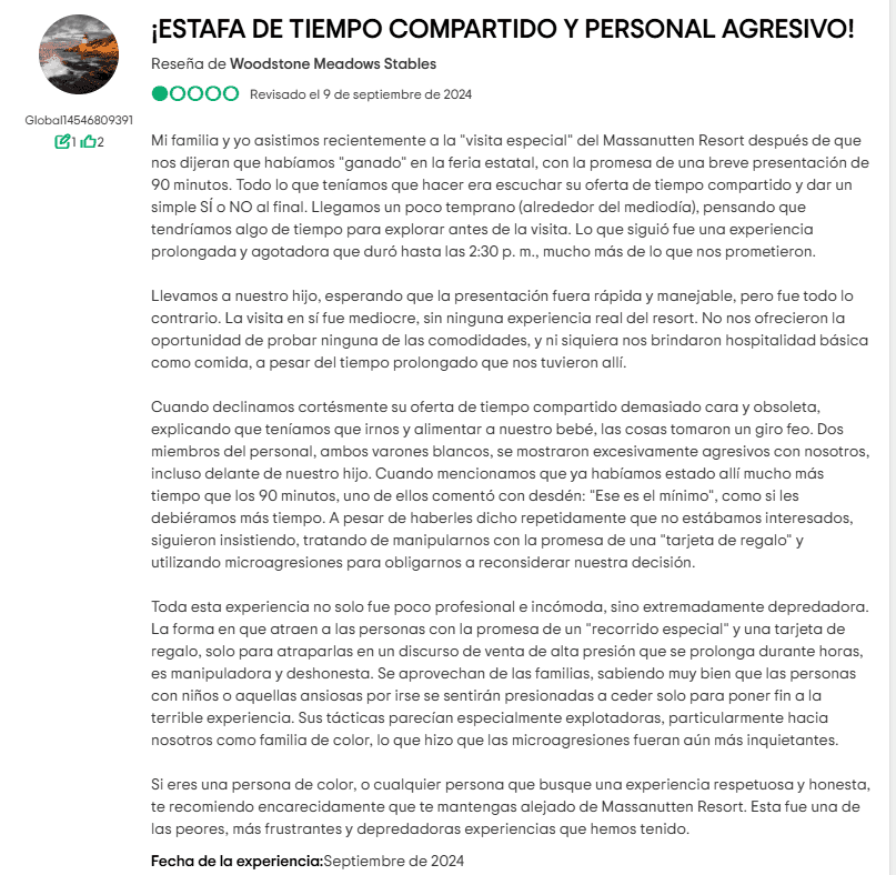 Por ejemplo, a algunos clientes se les prometió que su tiempo compartido aumentaría de valor o que alquilarlo sería fácil y rentable, solo para descubrir más tarde que ninguna de esas promesas era cierta. Y una vez que estás dentro, salir puede parecer casi imposible. Muchos han informado sobre dificultades para cancelar sus contratos o incluso para recibir respuestas claras por parte de los representantes de Massanutten.