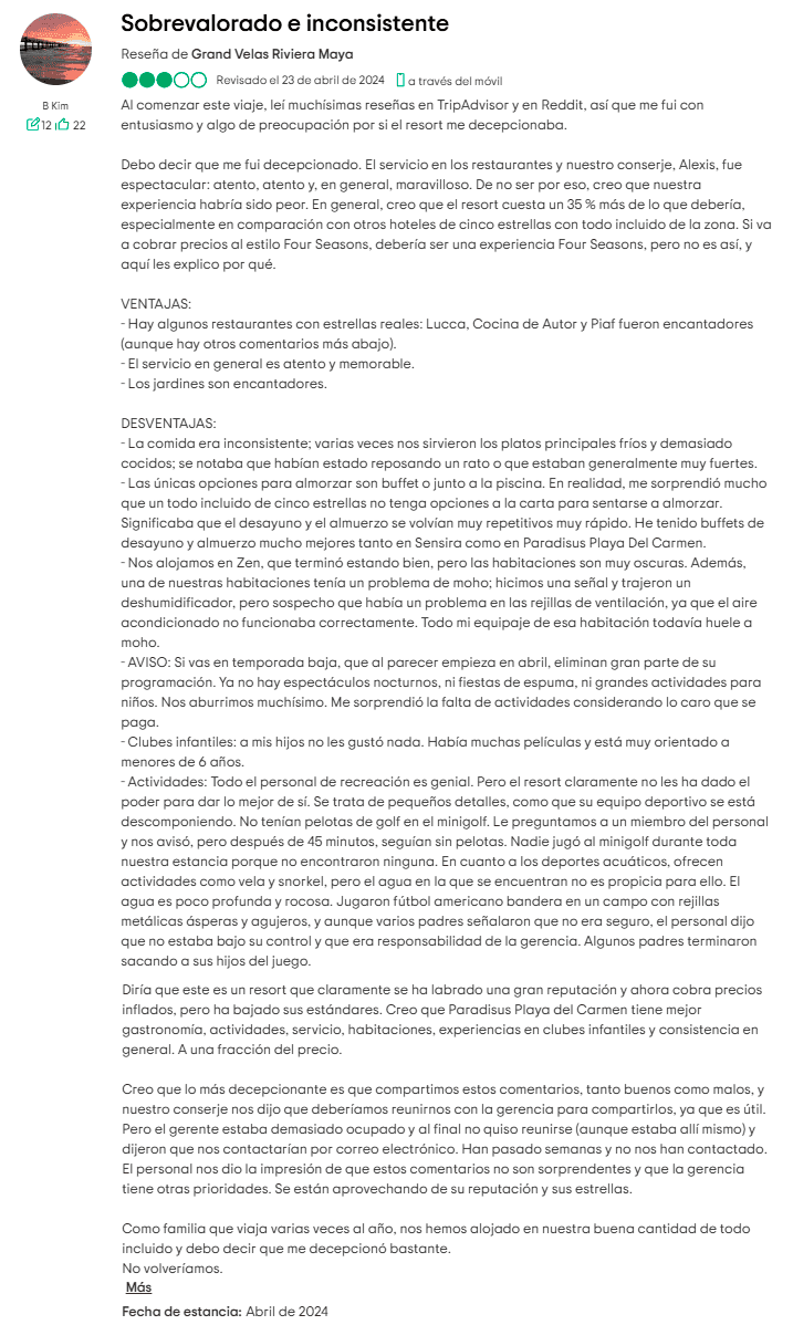 4. Seguridad: situaciones preocupantes: Algunos viajeros han tenido experiencias desconcertantes, como objetos que desaparecen de sus habitaciones. Un huésped en Riviera Maya reportó la pérdida de su Fitbit; el personal afirmó haberlo encontrado, pero nunca fue devuelto. Aunque no es lo común, basta para generar desconfianza—más aún cuando los contratos de propiedad no son fáciles de romper.