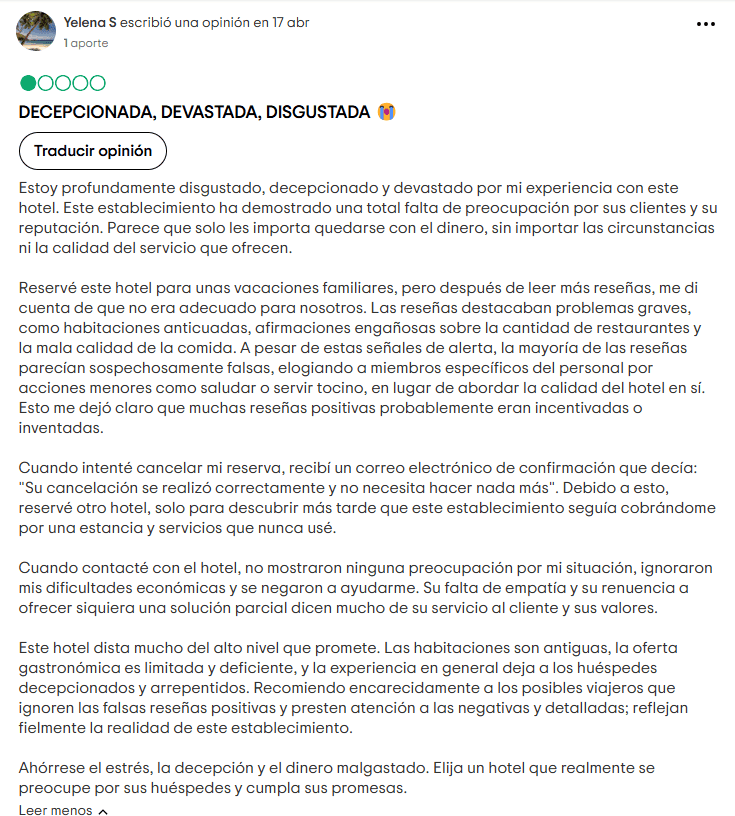 Hay informes recurrentes sobre presentaciones de tiempo compartido agresivas. Algunos huéspedes afirmaron que el proceso de ventas fue engañoso y que cancelar dentro del plazo legal fue complicado.
