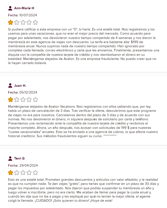 Según registros públicos y la Better Business Bureau, Avalon Vacation Resorts operaba desde Deerfield Beach, Florida, bajo el nombre de "Vacation Rentals". La empresa no tiene acreditación BBB y carece de un sitio web funcional, su dominio principal (avalonvacationresorts.com) está inactivo o tiene serios problemas de confianza detectados por sitios de seguridad en línea.