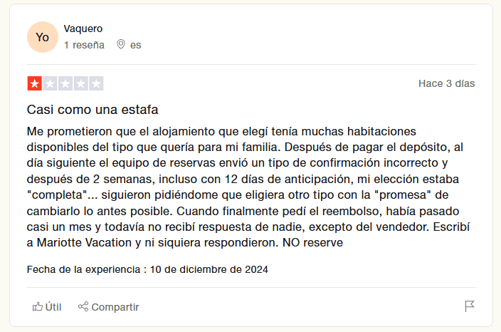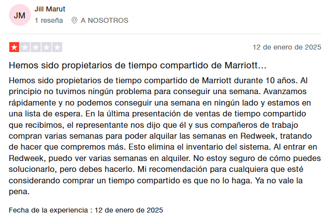 Marriott promete flexibilidad, pero buena suerte para reservar tus vacaciones soñadas. ¿Fechas y ubicaciones populares? A menudo no están disponibles. Las reseñas en TrustPilot revelan que el 82% de los propietarios calificaron a MVC con una miserable 1 estrella. ¿La queja principal? La dificultad para asegurar reservas en las fechas deseadas—un defecto fundamental en un sistema basado en la promesa de vacaciones "en cualquier momento, en cualquier lugar".