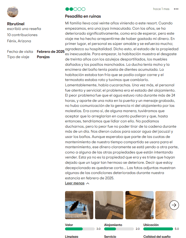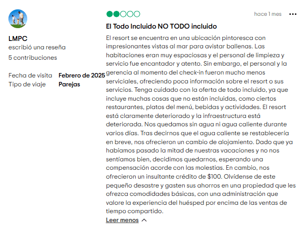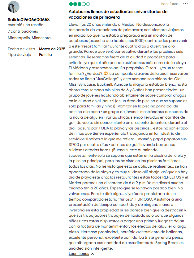 - Tácticas de Venta de Tiempos Compartidos: Una de las quejas más grandes es la agresiva y fuerte presión de venta de tiempos compartidos. Muchas personas se han sentido engañadas con los beneficios y atrapadas en contratos que apenas entendieron. Las presentaciones pueden ser engañosas, y la presión para firmar es intensa.