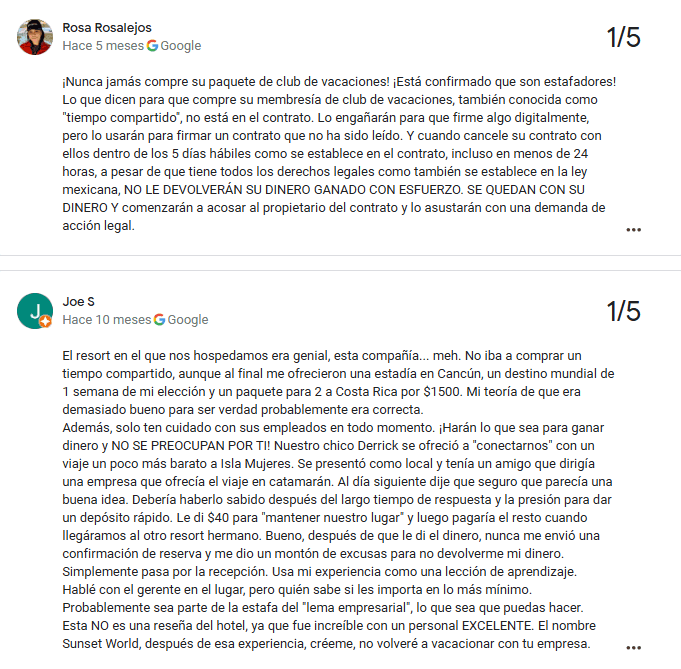Sunset Group opera en populares destinos vacacionales de México, incluyendo Cancún, Riviera Maya, Playa del Carmen e Isla Mujeres. A primera vista, parece una cadena de resorts típica. Pero profundiza un poco más—y con eso me refiero a leer reseñas de usuarios reales—y encontrarás un sinfín de quejas sobre su infame esquema de tiempo compartido, comercializado como "Club Sunset."