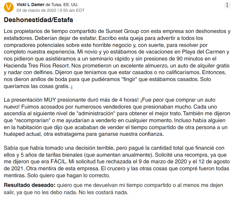 Muchos clientes alegan haber sido engañados durante las presentaciones de ventas. Una de las quejas más comunes involucra representantes de ventas prometiendo que la empresa compraría de vuelta su tiempo compartido después de un cierto período. Eso nunca sucede. En su lugar, los compradores se encuentran atrapados con un tiempo compartido que no quieren y no pueden usar.