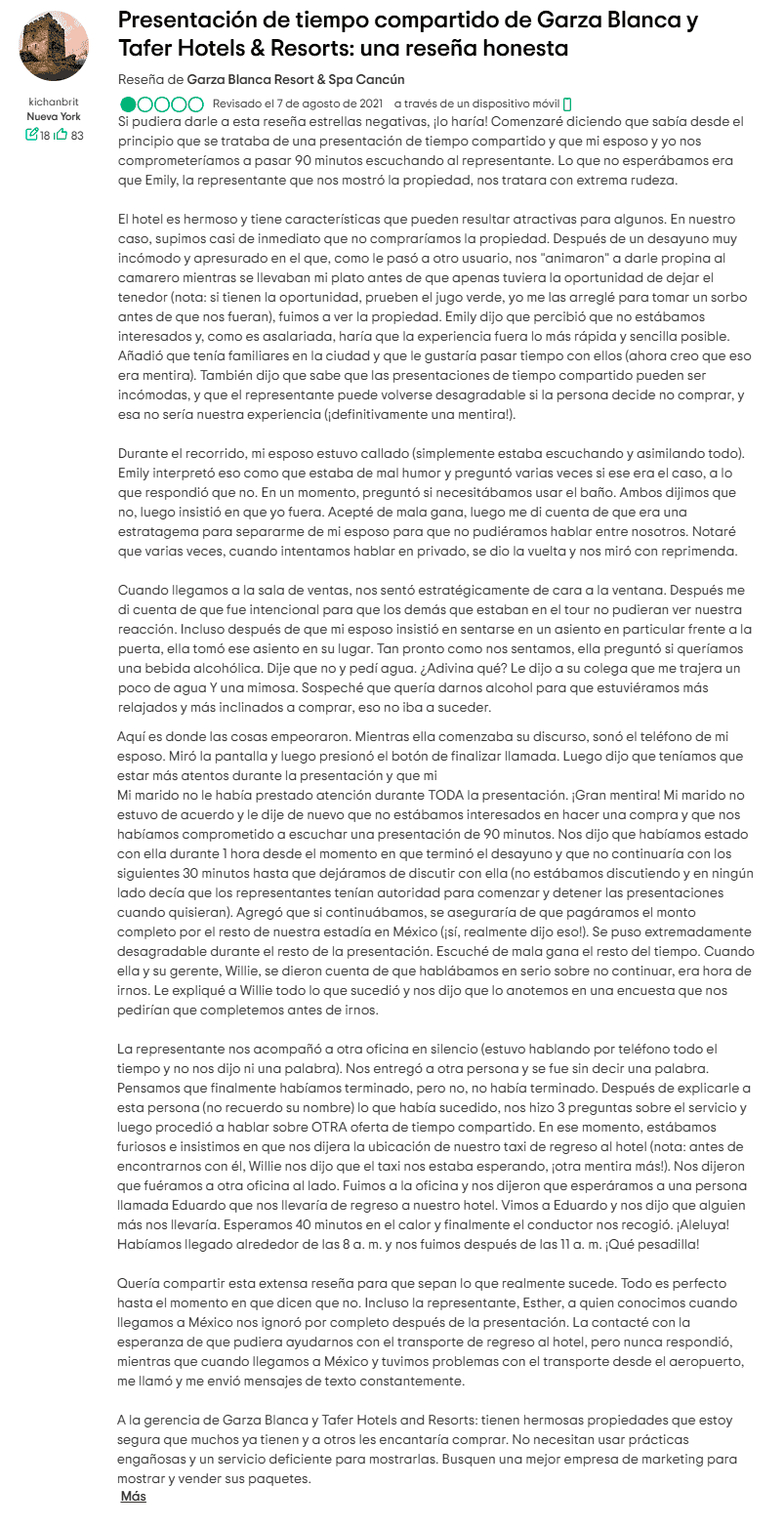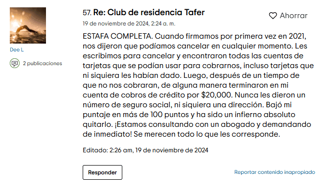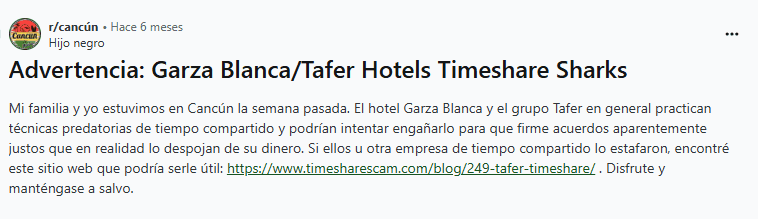 Escribe "Tafer Resorts estafa" en Reddit y te toparás con un tesoro de quejas. Los temas comunes incluyen tácticas de venta agresivas, como invitar a posibles clientes a desayunar solo para encerrarlos en presentaciones de alta presión donde parece imposible salir.
