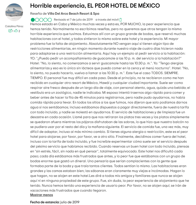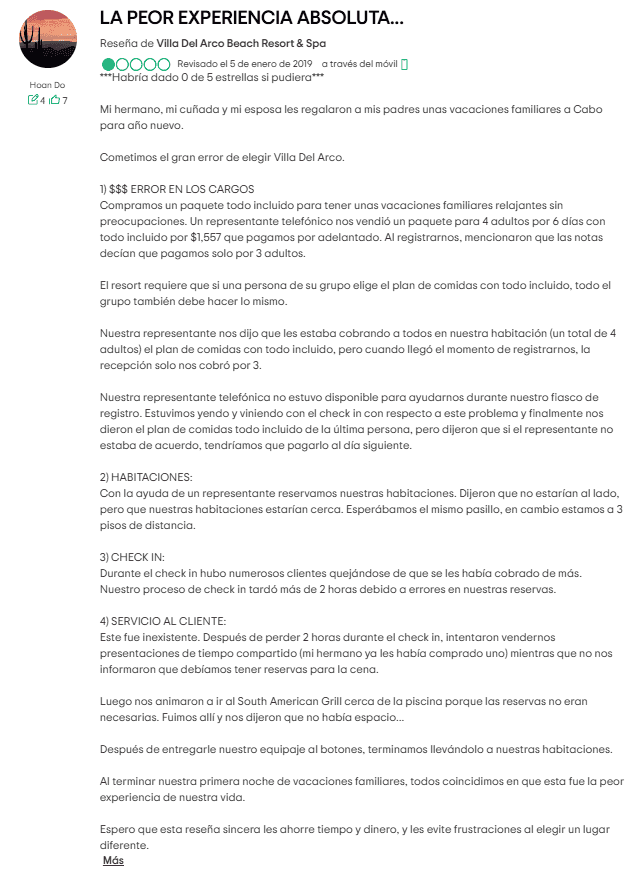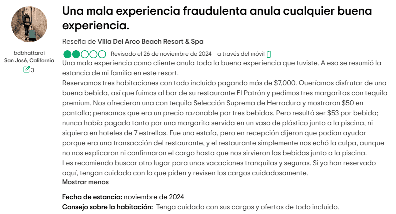 Otros han señalado que el costo total de una estancia en Villa del Arco puede ser más alto que un viaje a destinos más exclusivos como Hawái. ¿A dónde va todo este dinero extra? Ciertamente no a mejorar el servicio al cliente.