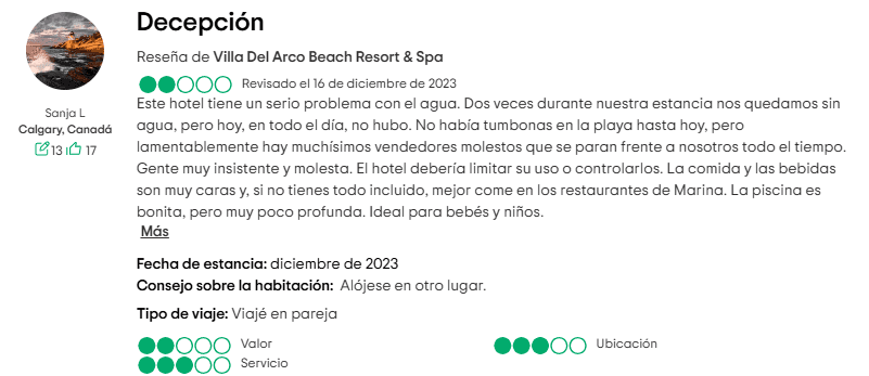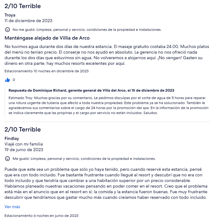 Aunque el sitio web de Villa del Arco presume de su experiencia de alta gama, las opiniones de los huéspedes sugieren lo contrario. Varios visitantes han expresado frustración con el concierge y la administración del resort, citando una falta de respuesta a solicitudes especiales. Algunos ejemplos incluyen: