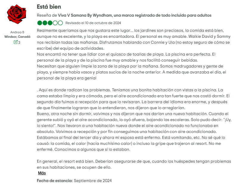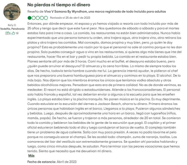 - Cobros y tácticas de venta: Se han registrado cargos inesperados en las cuentas (por ejemplo, tarifas de masajes que solo se eliminaron tras discutirlo). Las agresivas presentaciones de tiempo compartido son otra queja recurrente, con huéspedes que reportan haber sido presionados para unirse al "Viva club" o arrastrados a largas sesiones de ventas que se sienten engañosas.