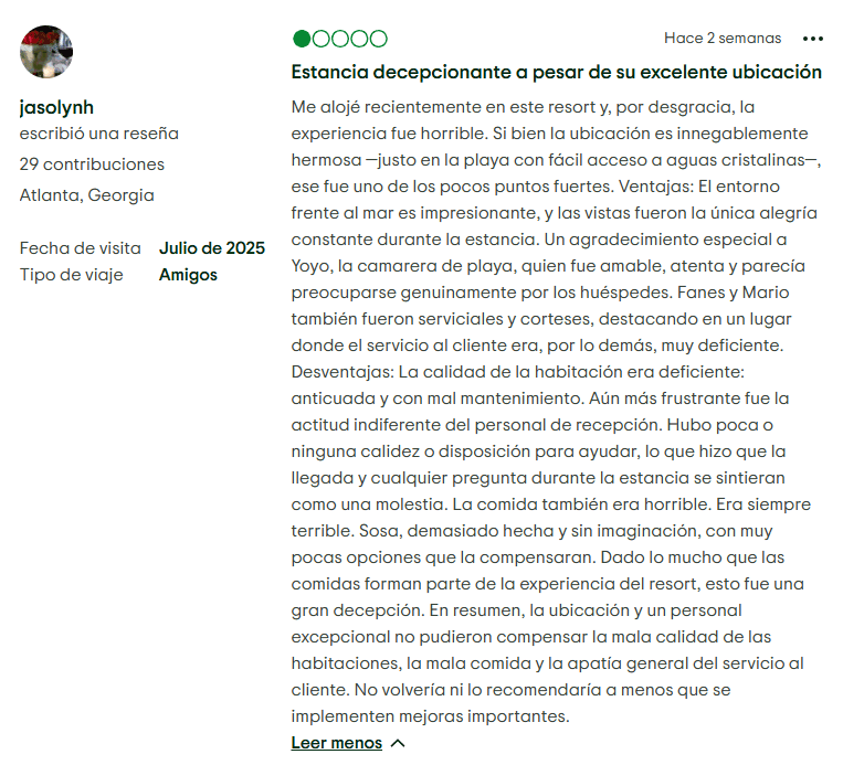 - Experiencia en declive: Los problemas como moho, insectos y cortes de electricidad sugieren falta de inversión en mantenimiento e infraestructura. La mala calidad de la comida y el servicio indiferente apuntan a problemas de gestión más profundos. Para un propietario, esto significa pagar cuotas de mantenimiento anuales por un producto en deterioro. La dificultad para reservar restaurantes a la carta o la presión por vender más membresías convierten cada estancia en un trámite más que en un escape privilegiado.