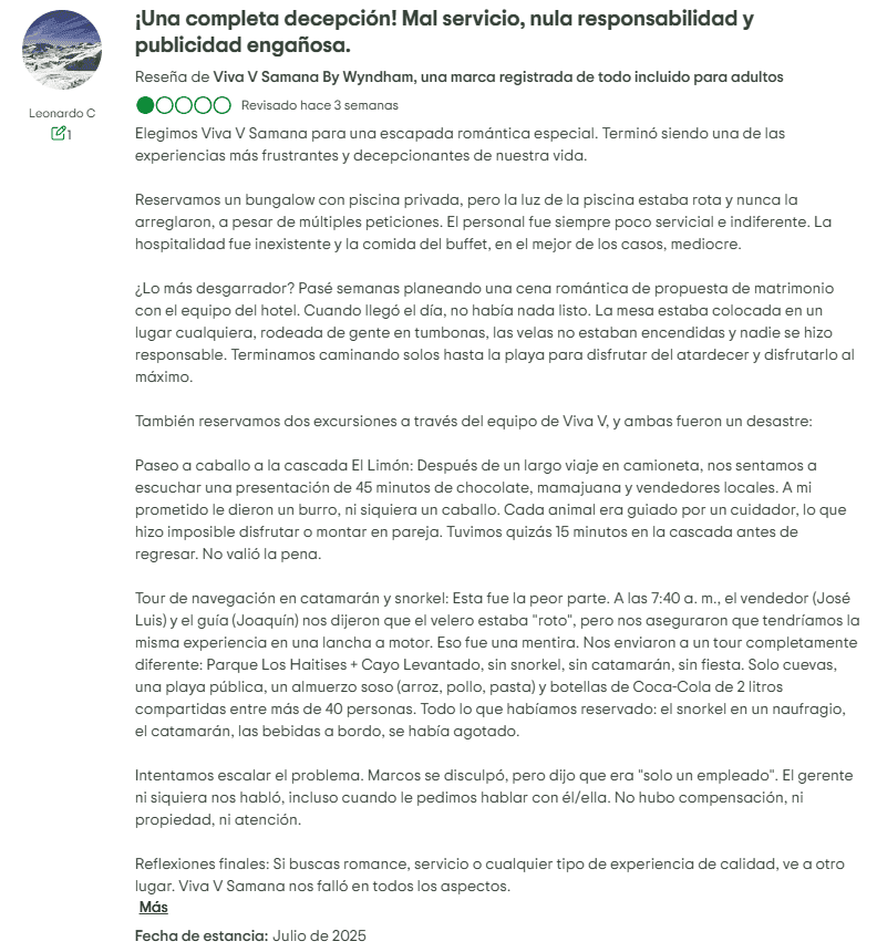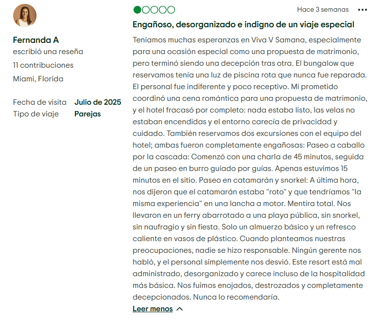 Para los visitantes potenciales, y en particular para los propietarios de tiempo compartido, estos problemas consistentes generan preguntas importantes sobre el valor y la viabilidad a largo plazo del resort. Desde preocupaciones de mantenimiento hasta deficiencias en el servicio, los problemas en Viva V Samana van más allá de las quejas típicas de vacaciones, afectando potencialmente a quienes han hecho compromisos financieros mediante la compra de tiempos compartidos.