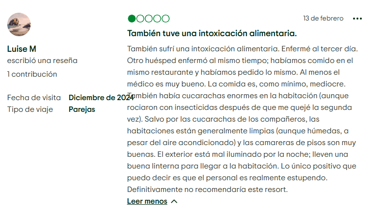- Problemas de comida y restaurantes: El buffet ha sido descrito como mediocre, frío o insípido, con menciones de moscas y condiciones poco higiénicas. Las reservaciones en restaurantes a la carta pueden ser un fastidio, algunos huéspedes no pudieron conseguir mesa pese a haber sido prometido el acceso.