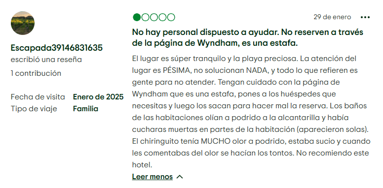 - Dificultad de reventa: La asociación con Trademark Collection de Wyndham, aunque añade visibilidad, también añade burocracia corporativa. Esto hace que resolver quejas individuales sea casi imposible. Con tantas reseñas negativas accesibles en línea, revender tu tiempo compartido en el mercado secundario se vuelve muy difícil. En vez de un activo, se convierte en un pasivo.