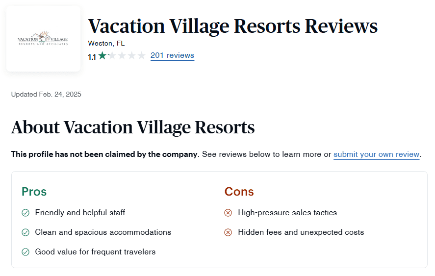 Vacation Village Resorts tiene una abrumadora cantidad de críticas negativas de clientes en múltiples plataformas. Actualmente tiene una calificación de 1.1 estrellas en ConsumerAffairs con más de 200 quejas, lo que la convierte en una de las empresas de vacaciones peor valoradas. La Better Business Bureau (BBB) le ha asignado una calificación F, en gran parte debido a su manejo de quejas de clientes.
