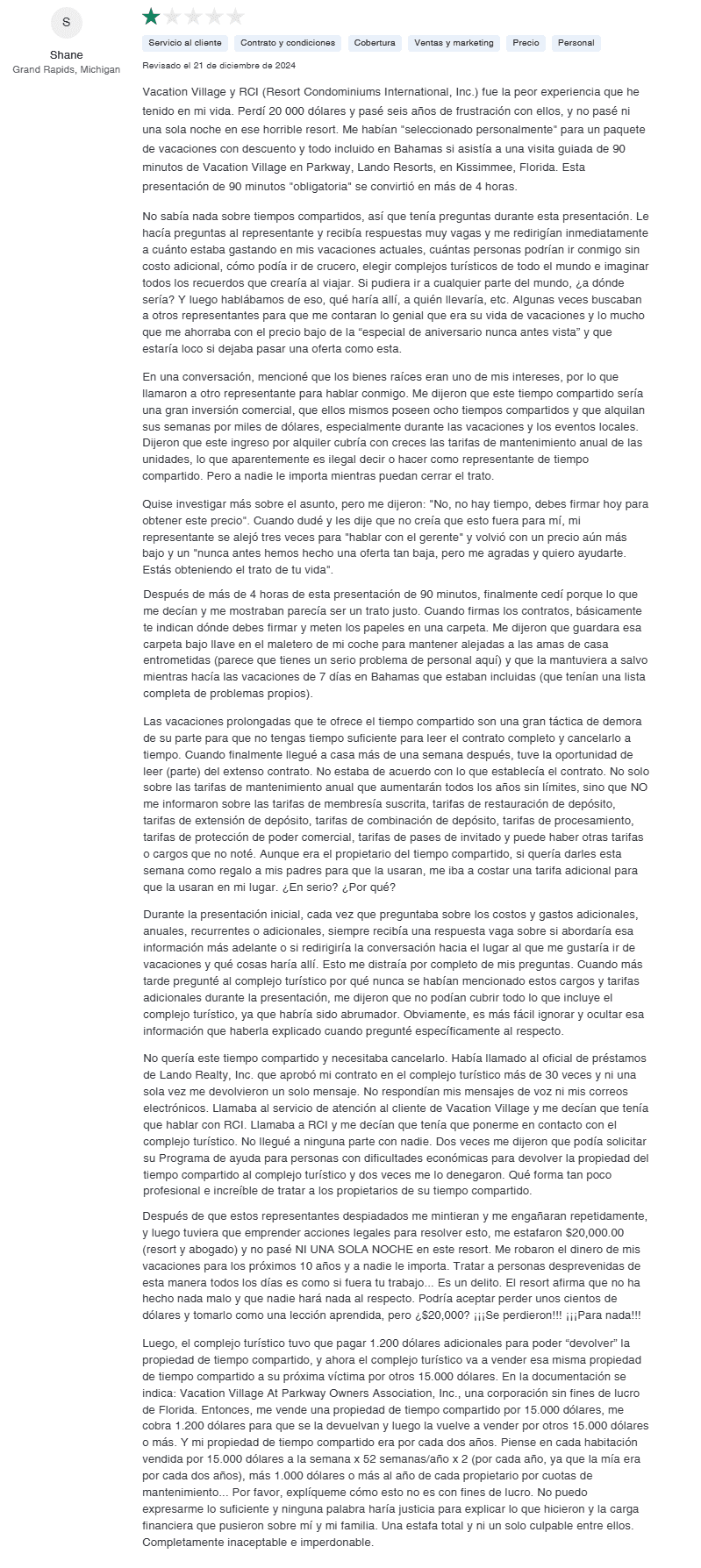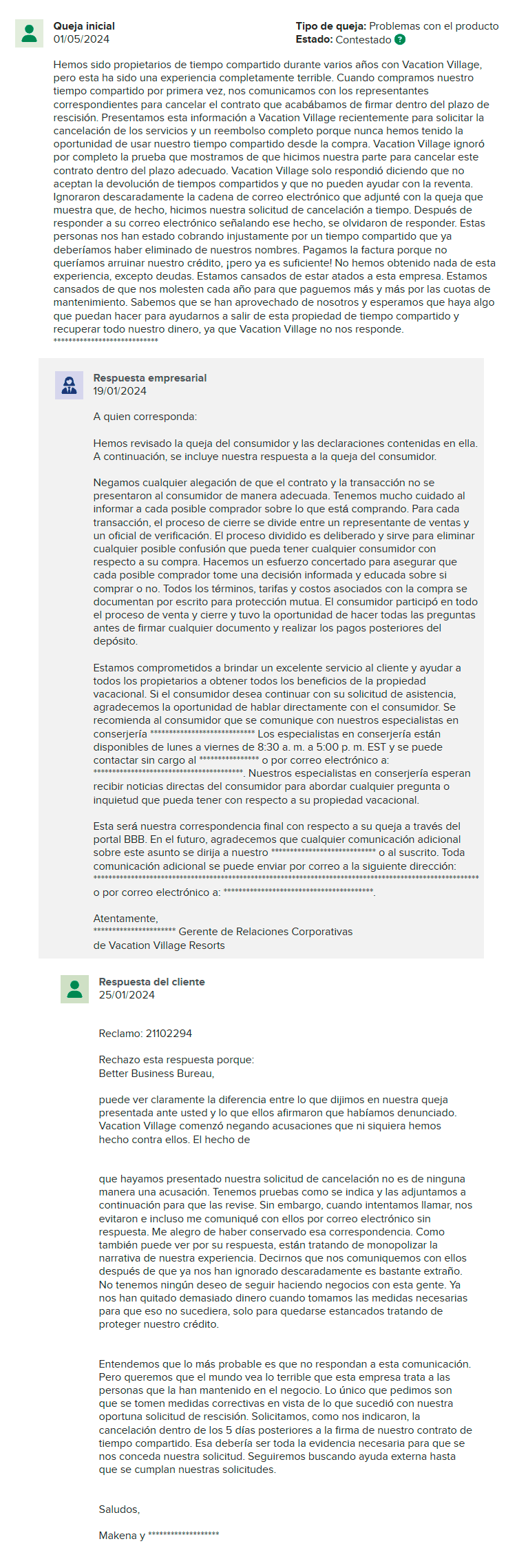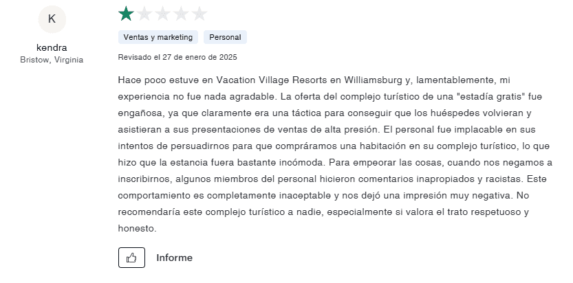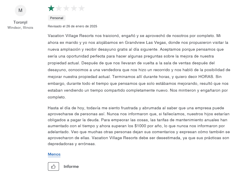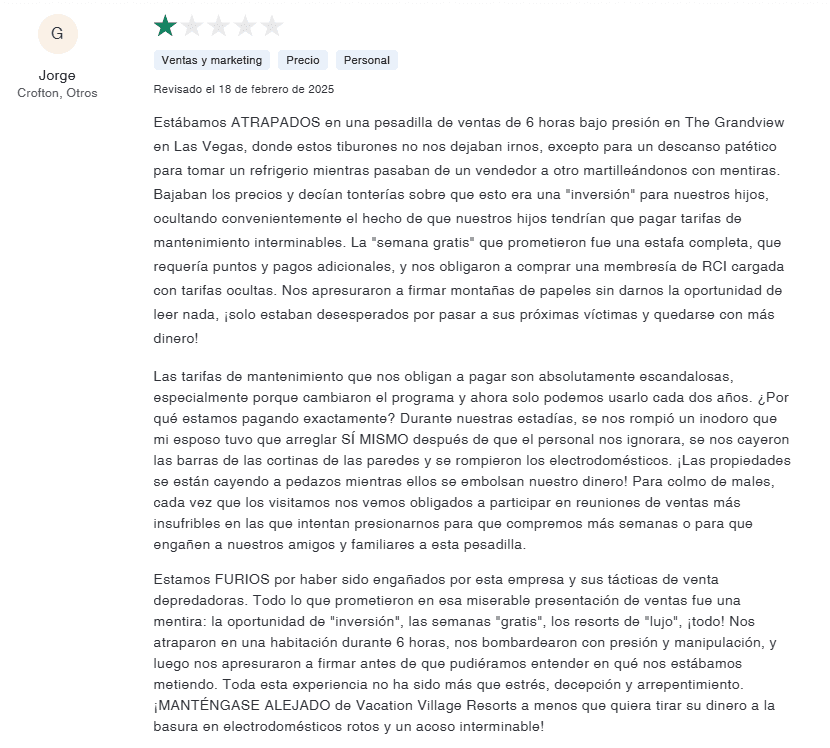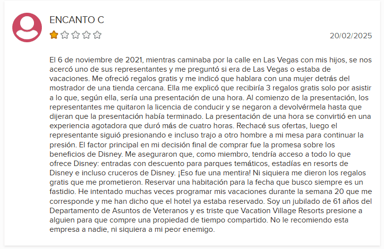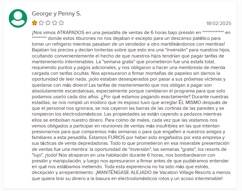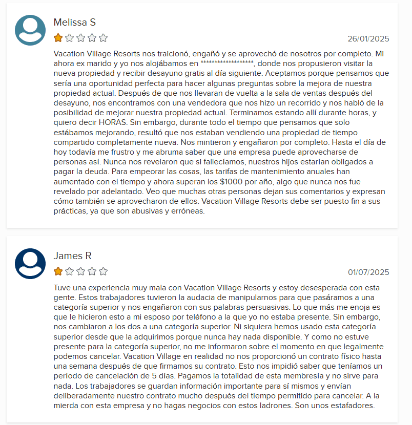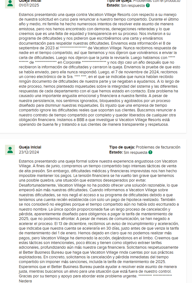 - Falta de mejora: Vacation Village Resorts no ha tomado medidas significativas para abordar su patrón de quejas.