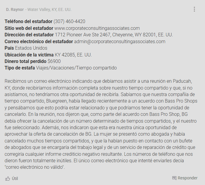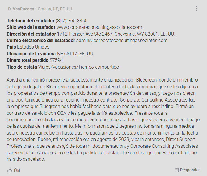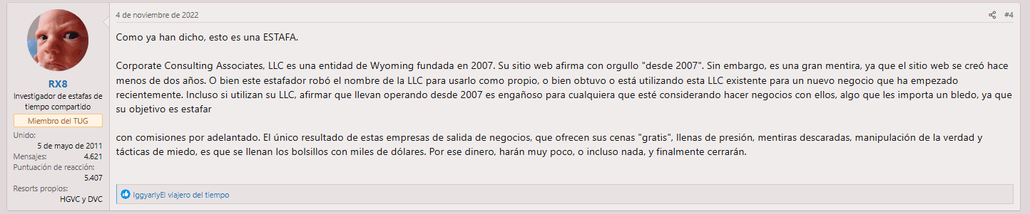 En resumen: Corporate Consulting Associates no es una empresa de fiar. Sus múltiples dominios, reseñas falsas, intentos desesperados de defenderse y vínculos con estafadores conocidos pintan un panorama muy claro. Se trata de una estafa de cancelación de tiempos compartidos con un historial de engaños, y debe evitarse a toda costa.