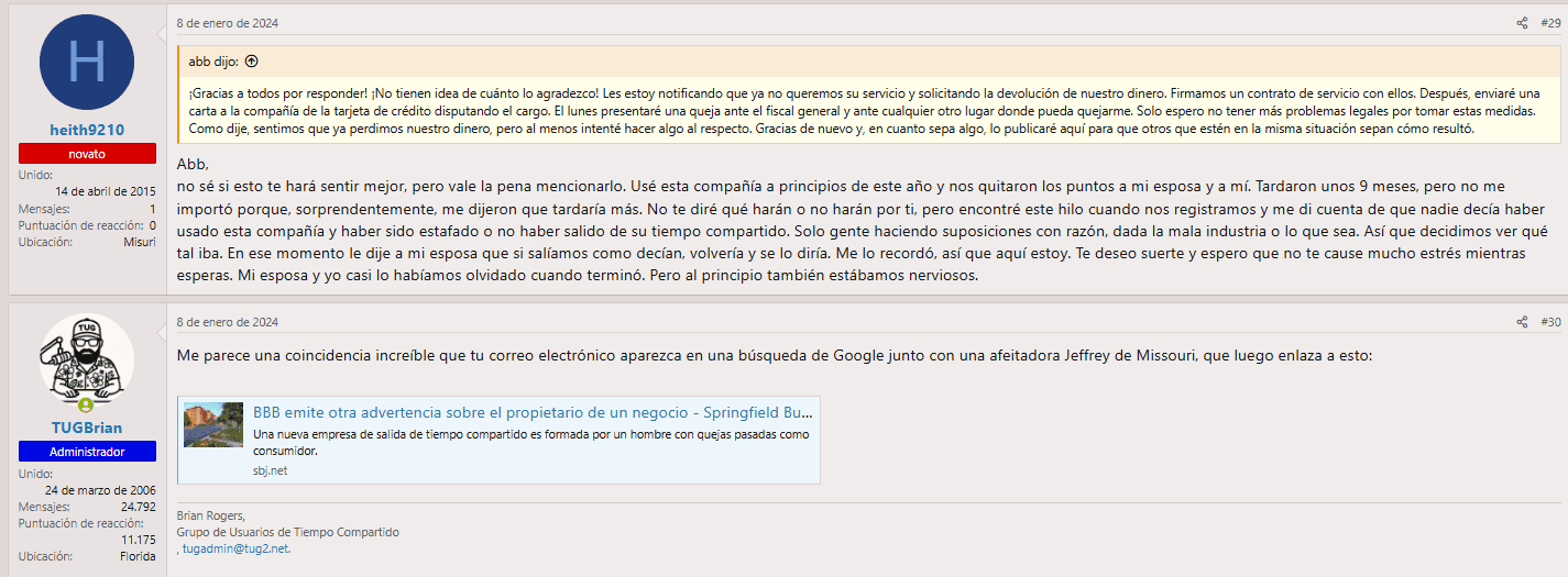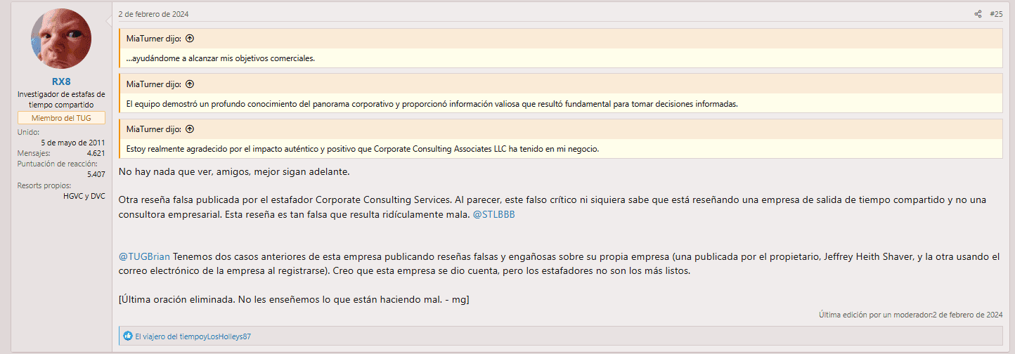 Un error particularmente torpe destaca en el dominio .com: una reseña duplicada bajo el nombre “Mia Turner”. Ese desliz se volvió relevante más tarde, cuando CCA intentó defenderse en el popular foro TUG de tiempos compartidos. Su intento de publicar bajo una cuenta falsa fue tan evidente que los usuarios rápidamente lo notaron — y se burlaron de ello.
