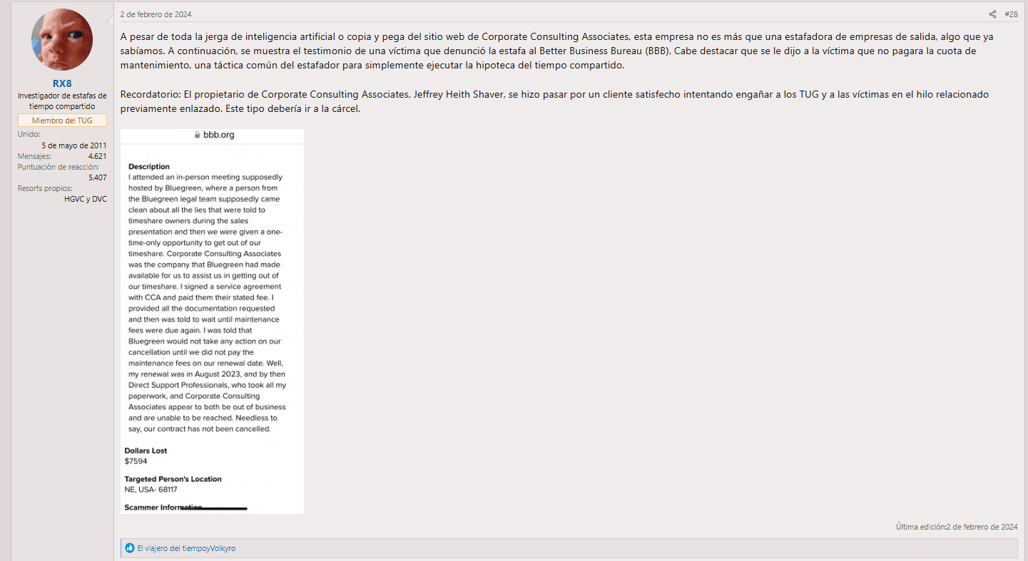 El foro TUG también arrojó más luz sobre los antecedentes de la empresa. Según un usuario, CCA es propiedad de Jeffrey Heith Shaver, un nombre vinculado a una larga cadena de estafas. La BBB ha emitido advertencias sobre su empresa anterior, Last Resort Fee, calificándola de fraudulenta, y también ha señalado a otra de sus iniciativas, Fountainhead Group, como otra operación engañosa.