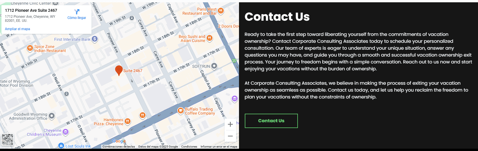 Corporate Consulting Associates es una compañía de cancelación de tiempos compartidos bastante extraña y sospechosa. A primera vista, podrías pensar que su sitio web principal es https://corporateconsultingassociates.org/ — pero en realidad también operan con una colección de dominios similares: .com (https://www.corporateconsultingassociates.com/), .co (https://corporateconsultingassociates.co/), e incluso .online (https://corporateconsultingassociates.online/).