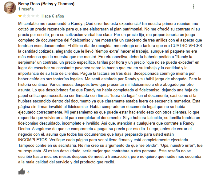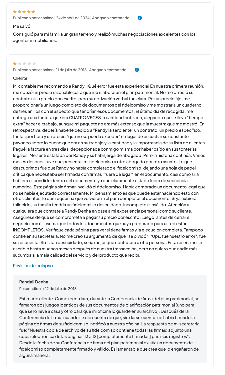 Por ejemplo, en Avvo, tienen una única reseña de 1 estrella, que coincide con una reseña igualmente desfavorable en su página de Google de hace seis años. Además, una reseña más reciente de hace un año sugiere prácticas potencialmente poco éticas. Con solo ocho reseñas en Google, el tamaño de la muestra es demasiado pequeño para sacar conclusiones definitivas. Además, su perfil en el Better Business Bureau (BBB) no está acreditado y carece de reseñas o quejas, dejando otro vacÃo en su reputación.