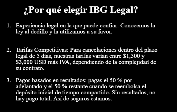 IBG Legal es una firma de abogados mexicana ubicada en Quintana Roo. Aunque su sitio web sugiere un enfoque en asuntos inmobiliarios—como adquisición de propiedades, fideicomisos y licencias—también ofrecen servicios de cancelación de tiempo compartido, denominados "terminación de contrato de tiempo compartido".