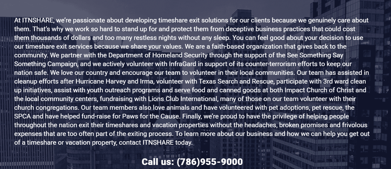 itnshare (sí, ese es realmente el nombre) es otra de esas firmas de cancelación de tiempos compartidos que aparecen de la nada, prácticamente desconocidas, que surgen cada cierto tiempo. Vienen, van… y si esta seguirá el mismo camino, está por verse. Por ahora, demos un vistazo a lo que itnshare ha estado haciendo...y a lo que hemos encontrado.