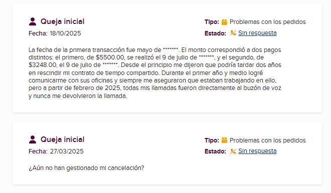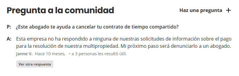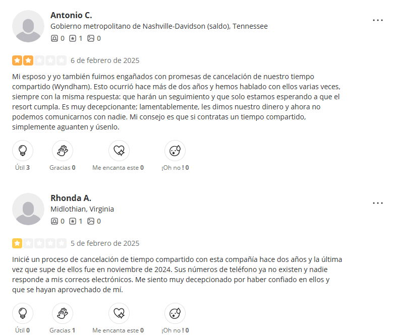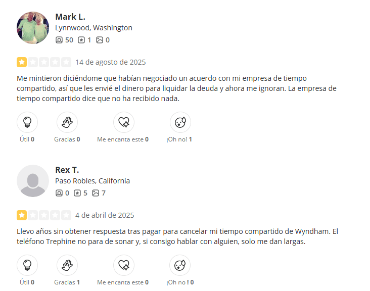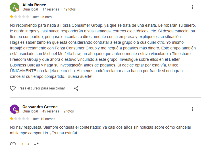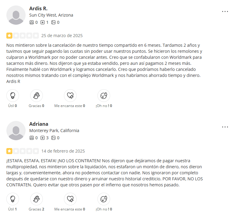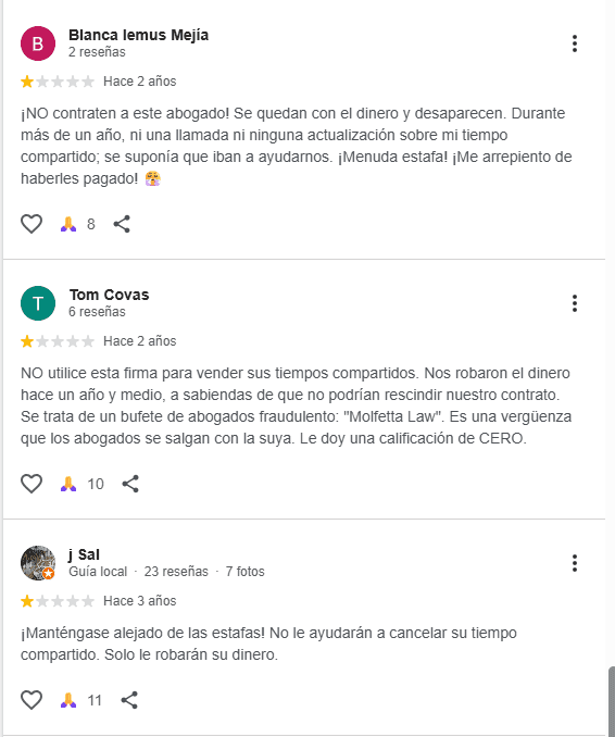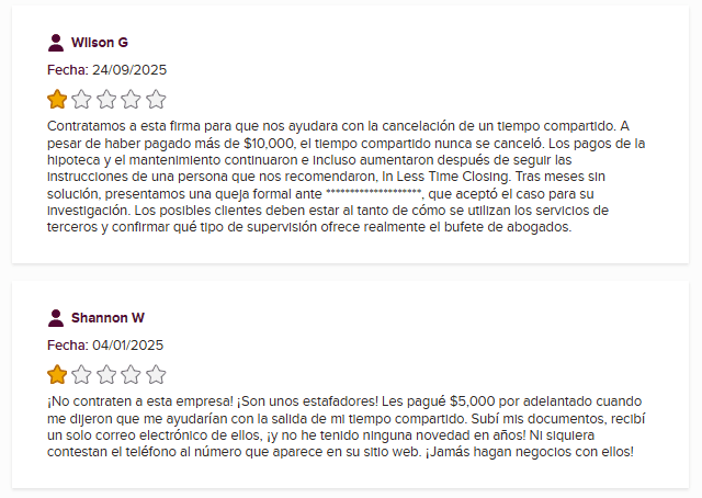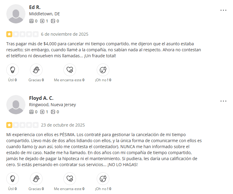 Las reseñas externas confirman la misma tendencia. En Yelp, el despacho cuenta con 2.1 estrellas y cerca de 30 reseñas, la mayoría recientes y sumamente negativas, especialmente relacionadas con sus supuestos servicios de cancelación de tiempos compartidos.