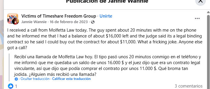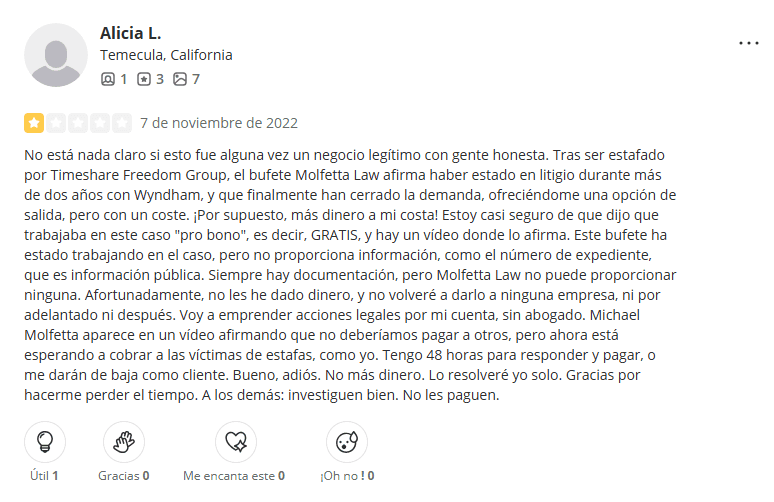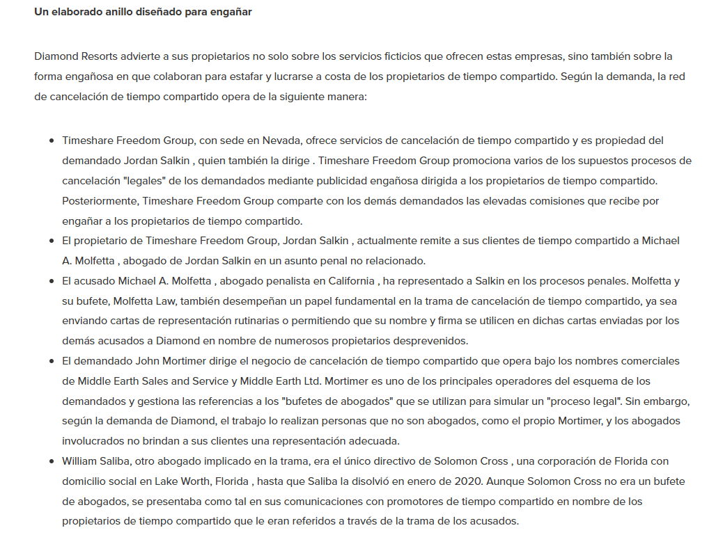 Por si fuera poco, en el año 2020, Diamond Resorts presentó una demanda contra Molfetta Law y varios asociados, acusándolos de participar en una red de estafa de cancelaciones de tiempos compartidos, cobrando por servicios que no cumplían. Un nombre que vuelve a aparecer en esa historia es el de Timeshare Freedom Group (TFG), del cual hablaremos con más detalle en su propio artículo.