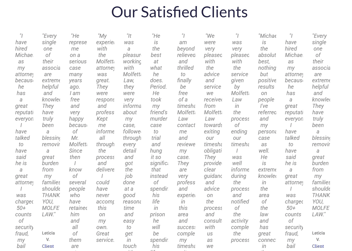El abogado principal, Michael Molfetta, parece haberse esforzado bastante por hacer que su nombre aparezca en todas partes de Internet. Se le describe en muchos lugares como un “abogado altamente confiable y reconocido”, pero cuando uno revisa los testimonios de sus clientes, la historia cambia drásticamente: la imagen pública no coincide con la experiencia real.