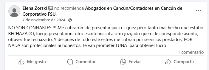 Corporativo FSU (Abogados de Cancún y Contadores de Cancún) es, como su título sugiere, una firma de abogados ubicada en Cancún, México. Aunque sus servicios están orientados a proporcionar asesoría legal y contable, su presencia en línea y la retroalimentación de clientes dejan mucho que desear. Aq...